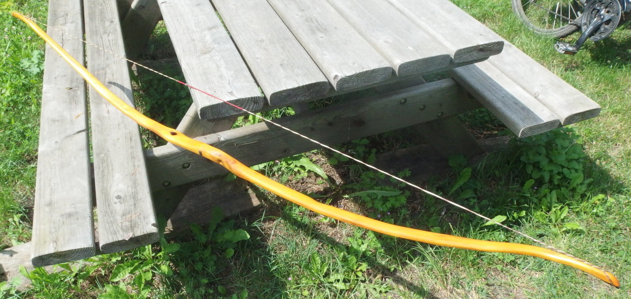 Bogenlänge 166cm (NtN ca. 165 also), relativ schmal (maximal 29mm), einige Äste, die ich entsprechend berücksichtigt habe. Sehne 10 Strang FF (Spectra 652). Gewicht ca. 530g. Der Bogen ist trotz seiner geringeren Breite relativ schwer, könnte an diesem Stück Holz liegen. So wirklich viel was zum wegnehmen sehe ich nicht. Nachdem ich die Tips nochmal schmäler und dünner gemacht habe, schießt er aber deutlich schneller. Die Tips sind noch ca. 9,5mm breit (ok, da ginge noch weniger