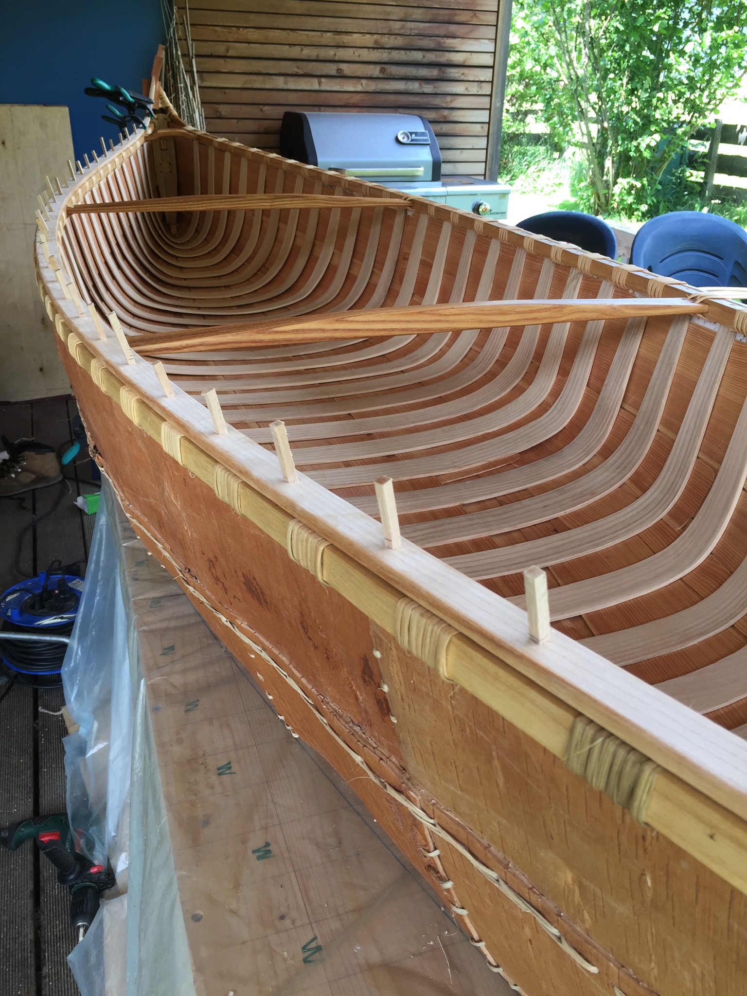 Ein paar Erleichterungen habe ich schon genommen. Dickenhobel, Bandschleifer, Stichságe, Bohrmaschine. Weißes Zedernholz gibts bei uns nicht. So habe ich Eschenholz genommen. Die Birkenrinde wird original mit Fichtenwurzeln vernäht. Habe ich dann auch zu ernten begonnen, aber gleich wieder abgebrochen. Der entstandene Flurschaden war zu groß. Zum Vernähen und für die Wicklungen habe ich Rattanstreifen flach und halbrund 5mm genommen. Innen habe ich alles mit 3mm Lärchenfurnier ausgelegt (das Sheating wird normalerweise auch mit Zedernholz gemacht). Zum Abdichten wird original Baumharz gekocht mit Holzkohle und Tierfett vermischt. Ich habe einen schwarzen Konstruktionskleber verwendet (klebt und dichtet, machen die Indianer mittlerer Weile auch). Ich habe das Boot sehr stabil gebaut. So könnten 3 Personen transportiert werden. Das Boot hat 27kg. Ohne Sheating und Rippen hat es 13kg gewogen. Als Soloboot gebaut, würde 1mm Fichtenfurnier und zartere und wenigere Rippen reichen (dann auch Fichte, weil leichter). Denke 20kg sind dann zu schaffen.