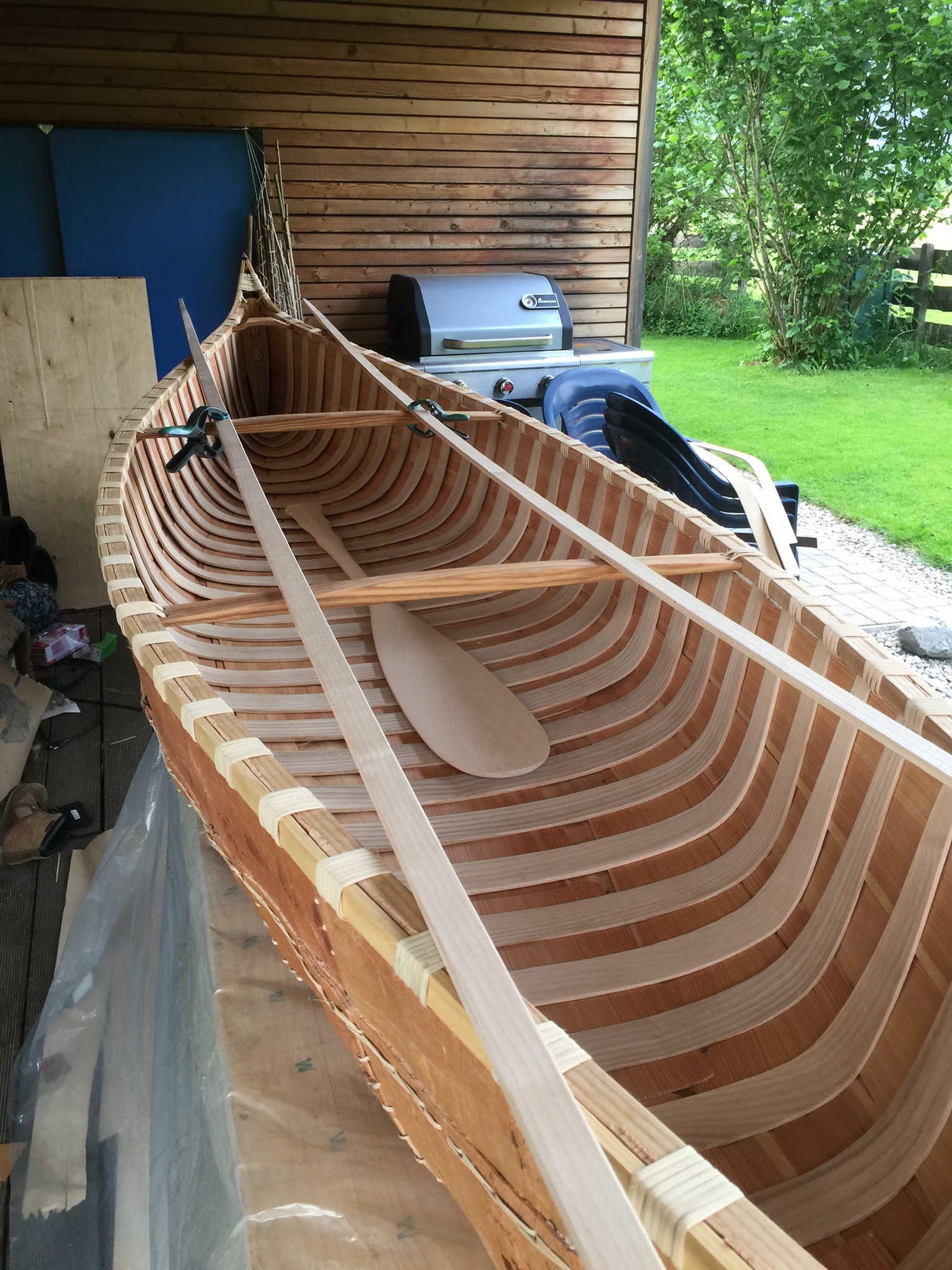 Ein paar Erleichterungen habe ich schon genommen. Dickenhobel, Bandschleifer, Stichságe, Bohrmaschine. Weißes Zedernholz gibts bei uns nicht. So habe ich Eschenholz genommen. Die Birkenrinde wird original mit Fichtenwurzeln vernäht. Habe ich dann auch zu ernten begonnen, aber gleich wieder abgebrochen. Der entstandene Flurschaden war zu groß. Zum Vernähen und für die Wicklungen habe ich Rattanstreifen flach und halbrund 5mm genommen. Innen habe ich alles mit 3mm Lärchenfurnier ausgelegt (das Sheating wird normalerweise auch mit Zedernholz gemacht). Zum Abdichten wird original Baumharz gekocht mit Holzkohle und Tierfett vermischt. Ich habe einen schwarzen Konstruktionskleber verwendet (klebt und dichtet, machen die Indianer mittlerer Weile auch). Ich habe das Boot sehr stabil gebaut. So könnten 3 Personen transportiert werden. Das Boot hat 27kg. Ohne Sheating und Rippen hat es 13kg gewogen. Als Soloboot gebaut, würde 1mm Fichtenfurnier und zartere und wenigere Rippen reichen (dann auch Fichte, weil leichter). Denke 20kg sind dann zu schaffen.