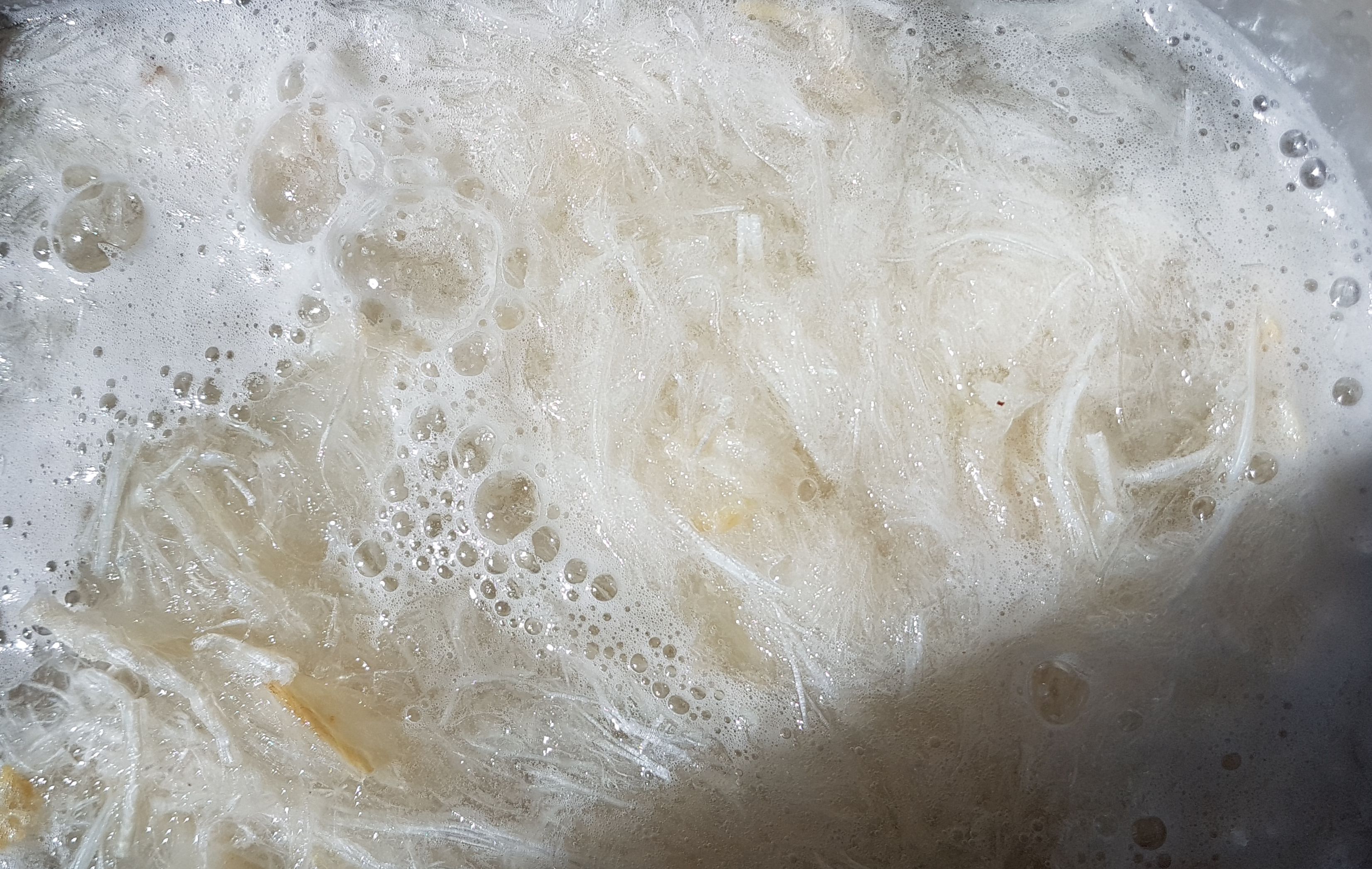 Sehnen gründlich waschen. Um evtl. verbliebenen Kalk zu neutralisieren, ins letzte Waschwasser etwas Salzsäure zugeben (im Beispiel ca. 2 cl, Konzentration 24%). Das Sehnenmaterial quillt nach der Zugabe stark auf - auf ausreichende Gefäß-Größe achten.