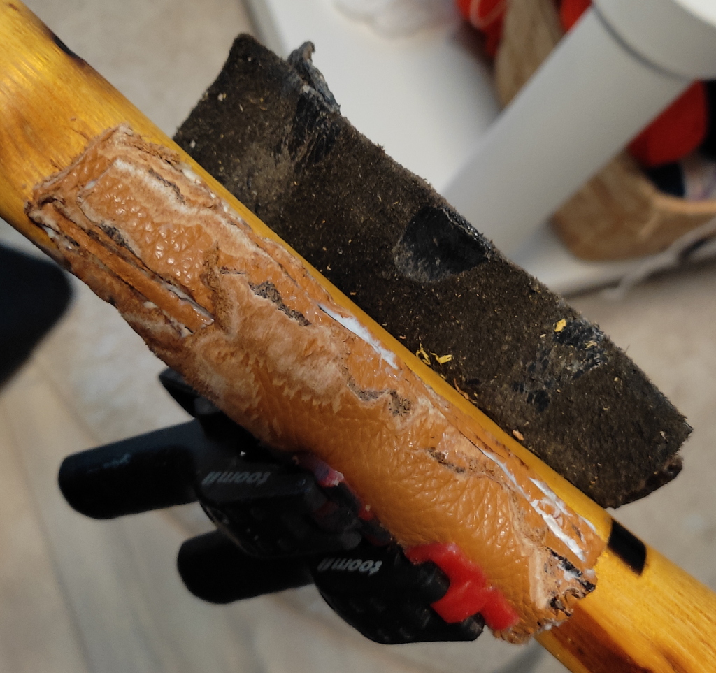 Ich muss das Griffleder sowieso nochmal runtermachen, weil der Griffaufbau oben etwas zu dick ist. Sah man erst nachdem der eigentliche Griff drum war. Dann kann ich das Griffleder auch noch mal passender zuschneiden. Das mit dem Spalt unten sieht doof aus. Das mit Rand oben umklappen wäre einen Versuch wert.
