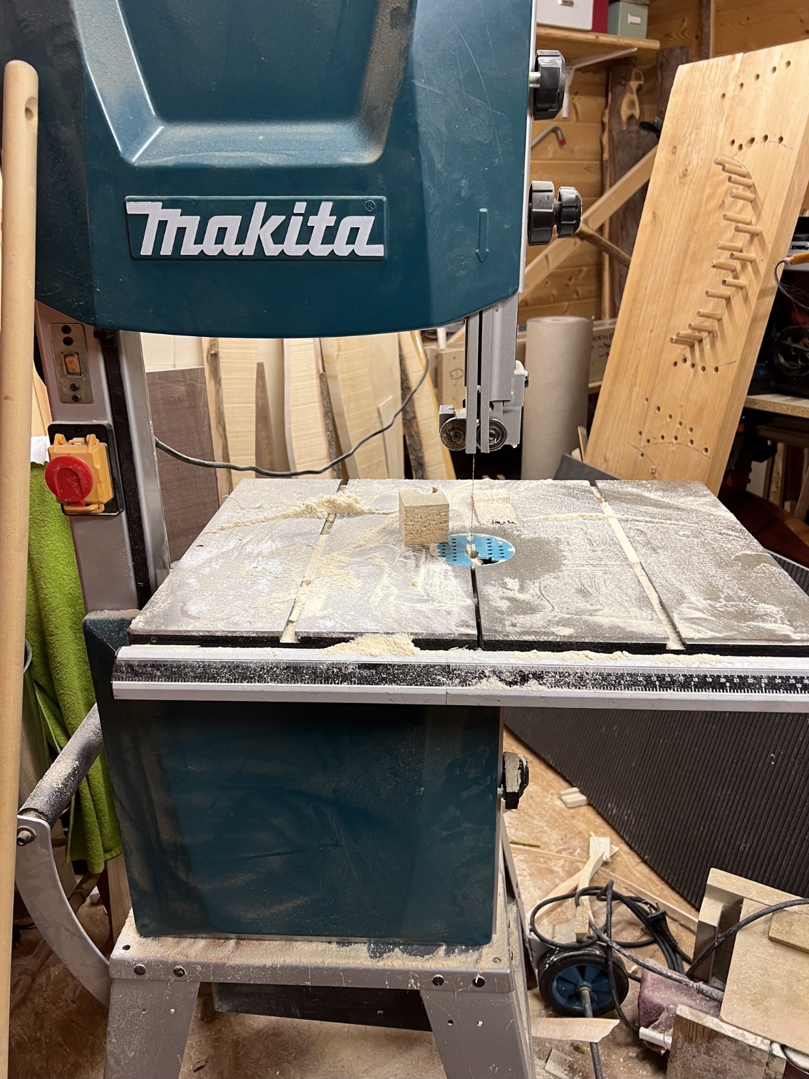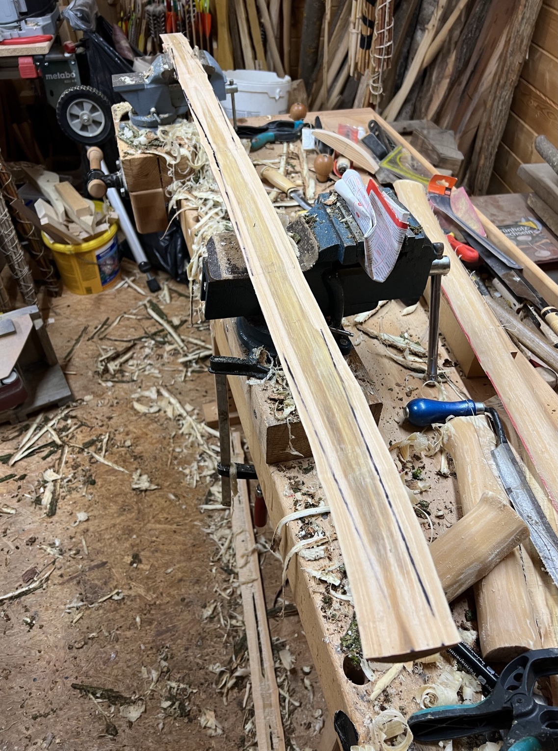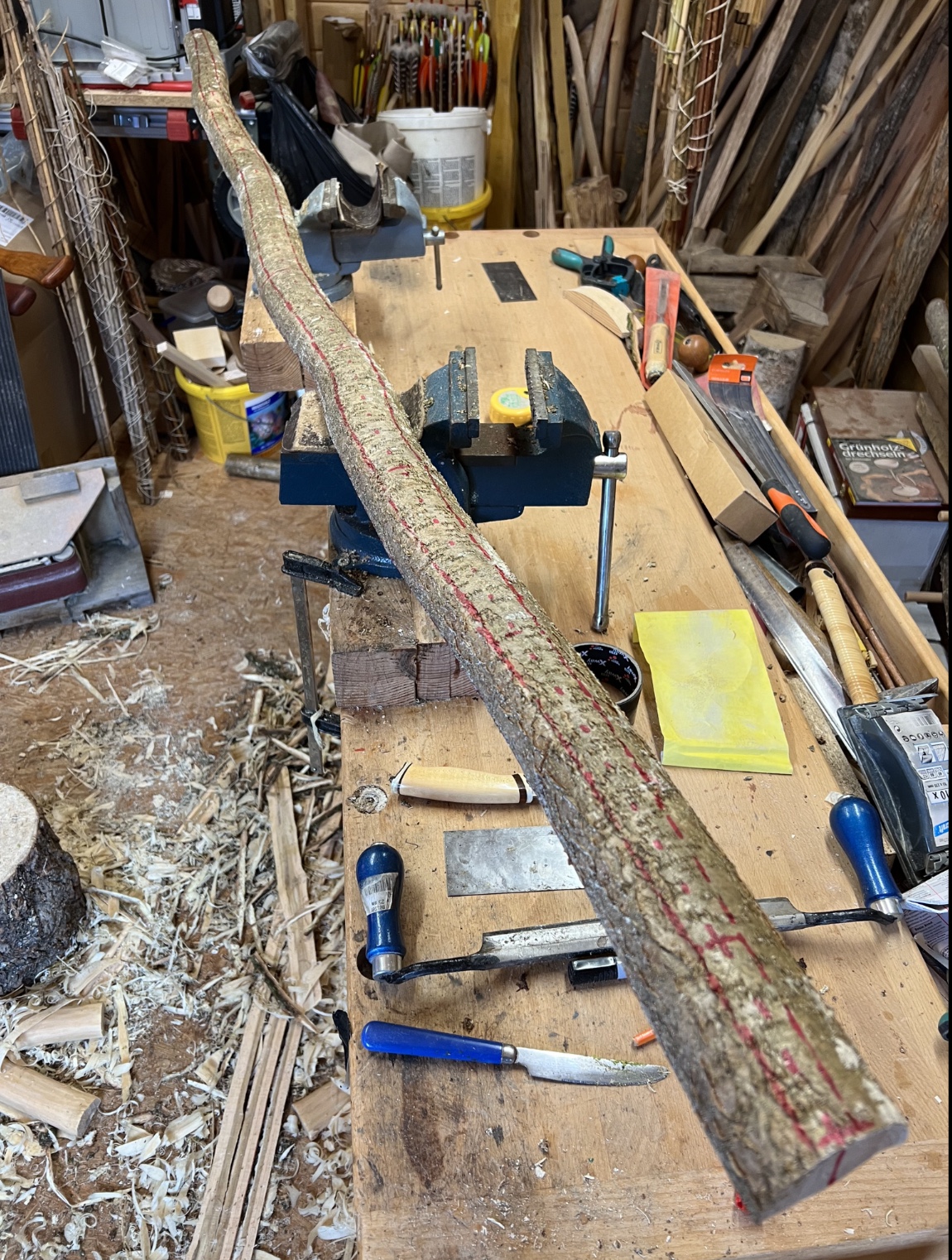 Weiter gehts mit dem Hasel. Mit der Bandsäge halbiert, Anzeichnung: Langbogendesign, Länge 192cm, Griff 4cm breit, 3 cm dick, getapert auf 2cm x 1,6cm, Rinde ab mit der Ziehklinge und dem Küchenmesser, die Enden mit Leim versiegelt, gewogen und ab in die Waschküche. Schöne Schlangenform