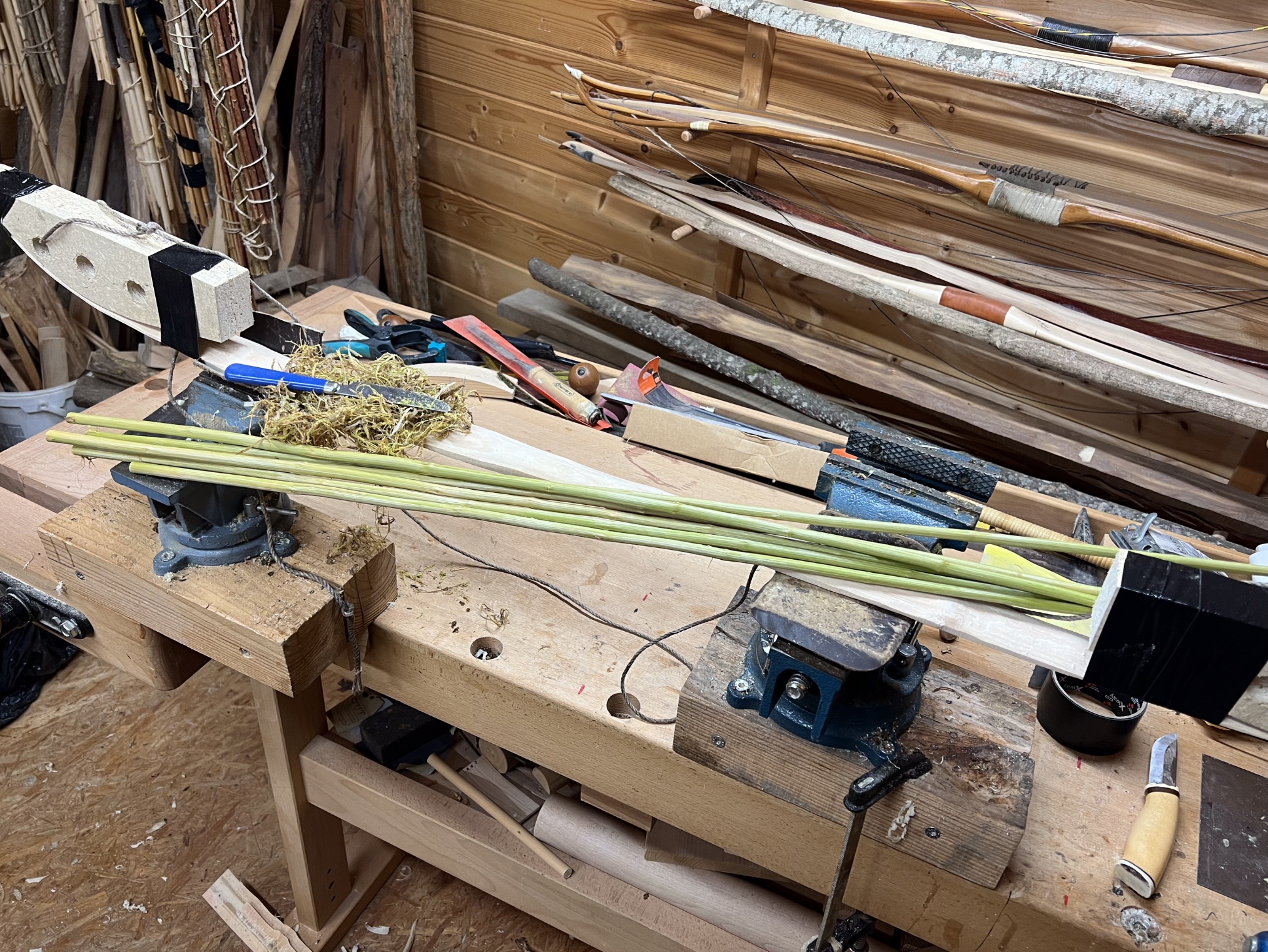 Bei uns gibt es ja noch Winter mit Schnee. Heute -5 Grad, die Rehe im Wald haben mich begleitet, natürlich immer mit Sicherheitsabstand. Geerntet habe ich 2x Holler, einmal gemeinen Flieder und einmal Hasel (super snaky) was schlägt Ihr vor: Langbogen oder Flachbogen? Aus den mit geernteten Haselabschnitten hab ich auch so eine Idee, sage ich aber noch nicht, aus dem dicken Holler ginge ein Paddelbogen, aus dem dünnen Holler und aus dem Flieder vielleicht ein hollow limb design. Alles nur Ideen und man muss sehen, was von den Saplings und von den Ideen nach dem Trocknen überbleibt und welcher Bogen es bis zur Präsentation schafft. Beim Langlaufen habe ich einen Gemeinen Schneeball entdeckt. Der Strauch steht unter einem Laubdach und hat schöne Schösslinge hervorgebracht. 6 davon habe ich heute mit geerntet und sollen nebenbei zu Pfeilen verarbeitet werden