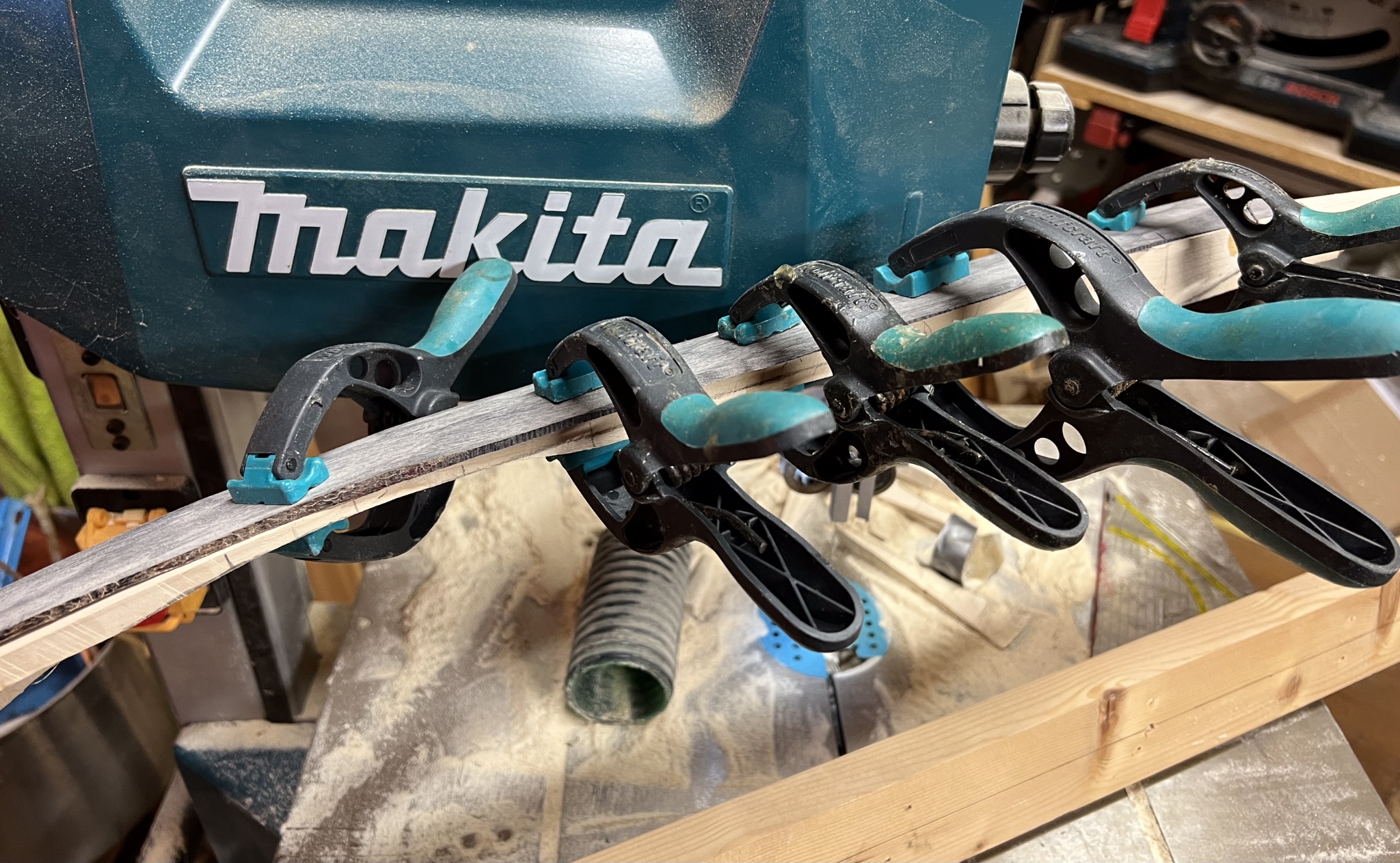 So, heute den Kompositbogen weiter gebaut. Der Wurfarm wird zuerst im Bauchbereich plan geschliffen und dabei beide Seiten in eine Ebene gebracht, dann wird nur im Bereich des Kasanauges der Wurfarm auf 5mm verschmälert. Dann wird der Bogen an eine Holzlatte geklemmt und dabei rückwärts vorgespannt. Der bestehende Deflex wird im Kasanauge durch das Vorspannen in einen leichten Reflex gezwungen. Dann werden die Hornplatten in der Breite angepasst. Auch hier wird die Dicke belassen. Der Holzrahmen und die Hornplatten werden erst nach dem Verkleben in Form gebracht. Verklebt wird mit Uhu Endfest 300. Beidseitiges Aufbringen des Klebers, intermittierendes Fixieren mit 2 Klemmen. Fixieren mit Klebestreifen, damit der Kleber bleibt, wo er sein soll wickeln mit einer Paketfolie. Dann erst die Klemmen drauf und warten bis morgen.