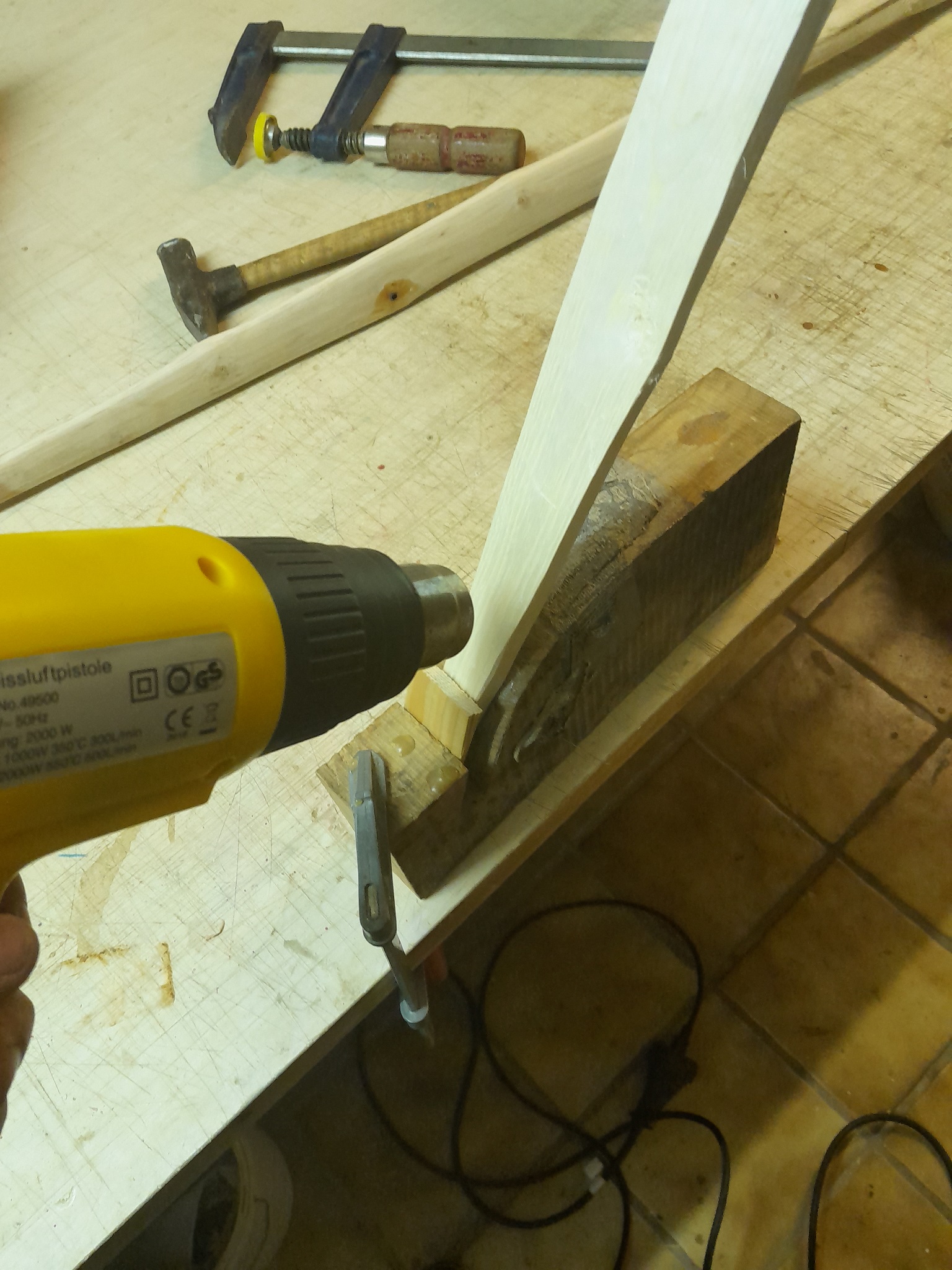 Gleich mal das noch nasse Holz genutzt und die HLP geschwungen. Das Gewicht der Schraubzwinge zieht den Bogen ohne Mühe in Form