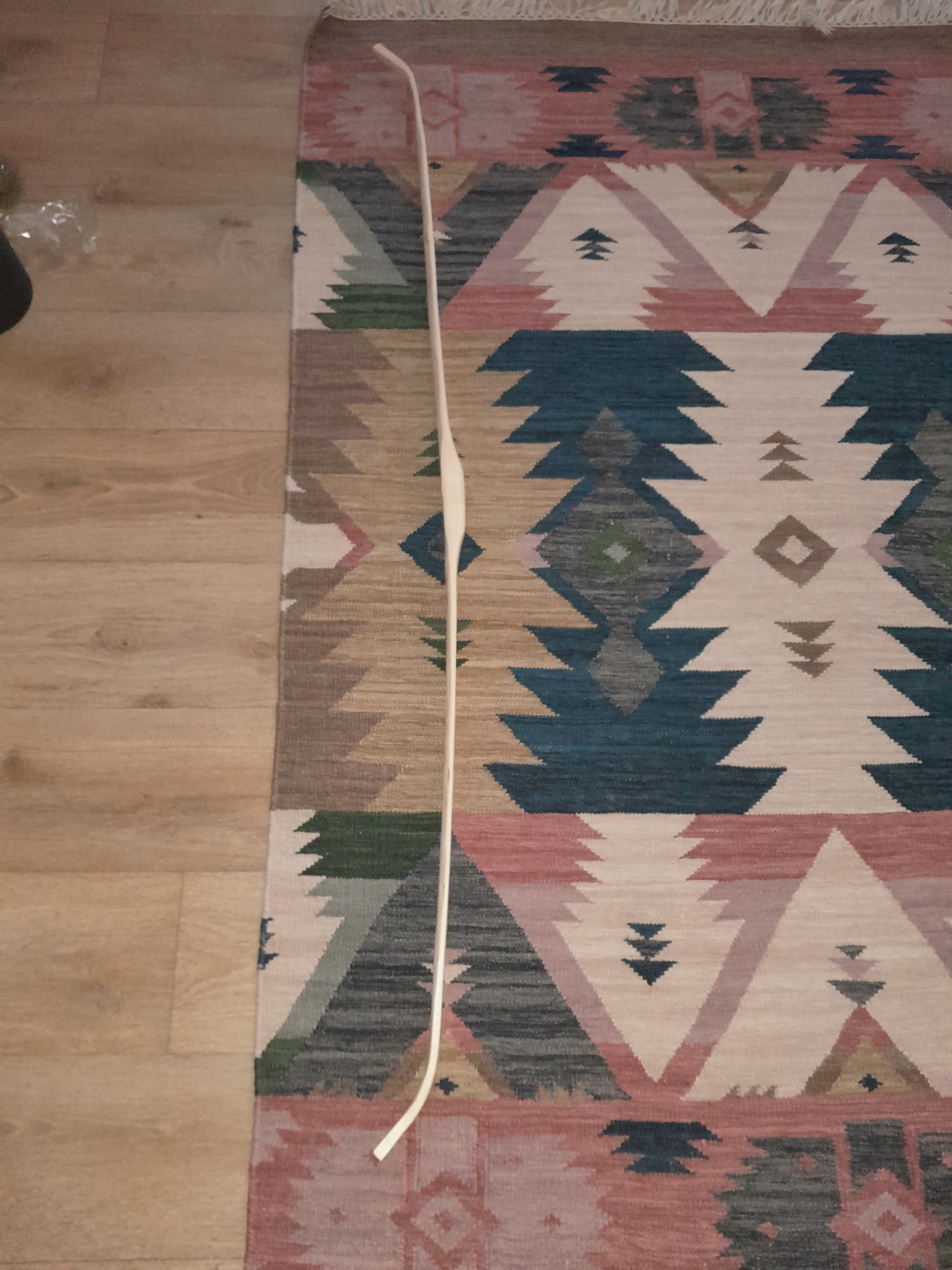 Ich habe den Bogen mit Hufhobel, Ziehmesser, Schweifhobel und Ziehklinge soweit runtergearbeitet bis er sich im Bodentiller leicht biegen hat lassen. Danach gings ins Wohnzimmer zum trocknen.