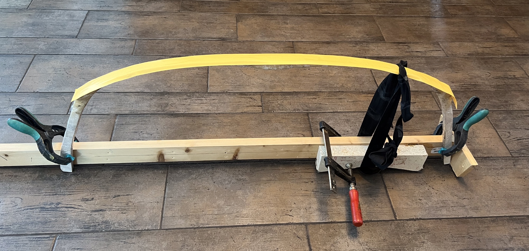 Auch der Hasel Kompositbogen hält sein Gewicht seit 2 Tagen und hat heute 1 Gramm zugenommen, 7,5cm hat er sich an der Leiste durch den zunehmenden Reflex verkürzt. Der Bogen kommt heute auch wieder in die Werkstatt, beim Anbiegen fühlt er sich noch sehr steif an, jenseits der 60 Pfund, werde etwas Horn abnehmen müssen!, dann auf das Tillerbrett. Bin schon leicht nervös