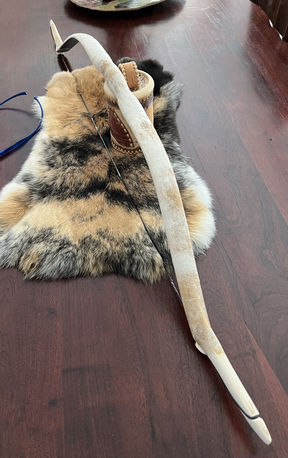 Haselreste Kompositbogen: Am Samstag habe ich den Bogen geschliffen, das Kasanknie noch, wie geplant, abgeflacht, 2 Stücke aus dem Knochen geschnitten und die Sehnenbrücken herausgearbeitet. Ev. sind die Sehnenbrücken etwas zu nieder, sonst muss ich sie gegen höhere Sehnenbrücken ersetzen (würde ich wahrscheinlich von den Hollerresten nehmen, oder Hirschgeweih), heute habe ich das Horn mit Isolierband abgeklebt und dann die Ziegenrohhaut 0,6mm aufgebracht. Wie immer stressig, weil ich einen durchgehenden Streifen genommen habe. Den Streifen dehnen, mit Klemmen fixieren, wickeln, Klemme springt ab, alles verrutscht…… Ich hoffe alle Luftblasen rausgepresst zu haben. Jedenfalls habe ich 3x mit Hosengummi sehr fest gewickelt, zusätzlich Klemmen. Die Ziegenrohhaut habe ich vorher mit Aceton entfettet und in warmem Wasser mit etwas Spülmittel für 2 Stunden eingelegt. Jetzt soll er bis morgen trocknen, bei den Tips hab ich immer noch etwas Spielraum in der Höhe und Breite gelassen, lG Stephan