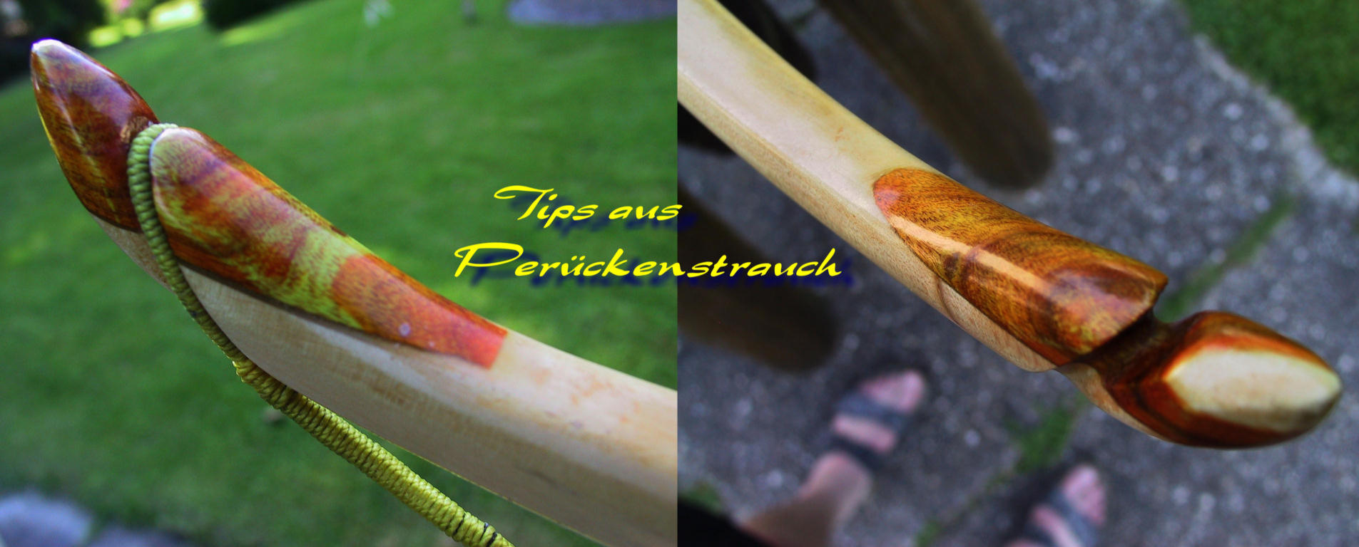Mit einem Bogen kann ich zurzeit nicht dienen, aber verwendet werden beide Hölzer auch zum Drechseln feiner Kunsthandwerks-Gegenstände, hier zwei Kreisel. Am Bogen lassen sich auch Griffe und Nocken mit dem feinen, weißen Holz unterlegen und kommen dadurch besser zur Geltung.