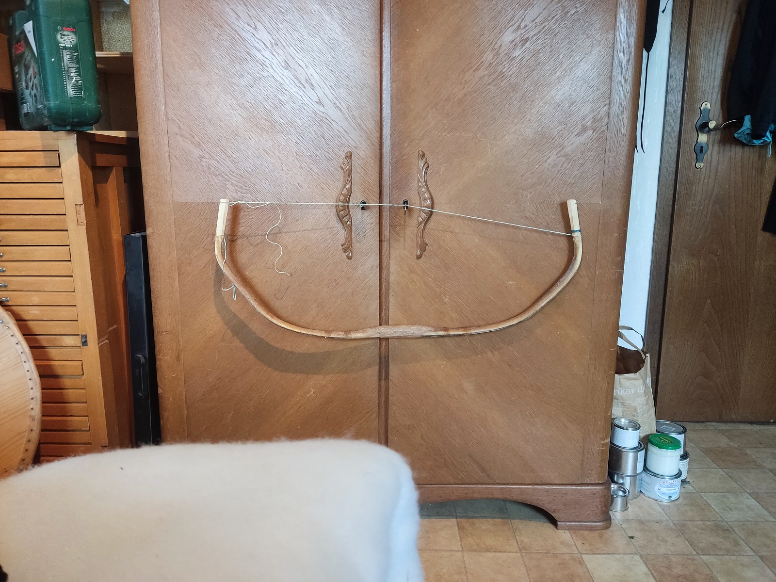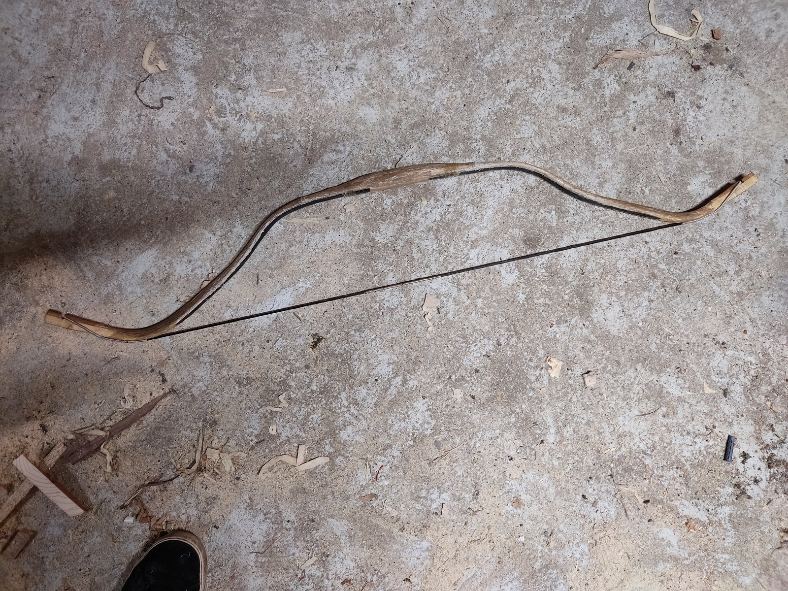 Nach zwei Tagen auf der Biegehilfe hab ich mich dann getraut eine Sehne aufzuspannen. Und siehe da, der Bogen hat es überlebt und die Biegung sah gar nicht mal so schlecht aus.