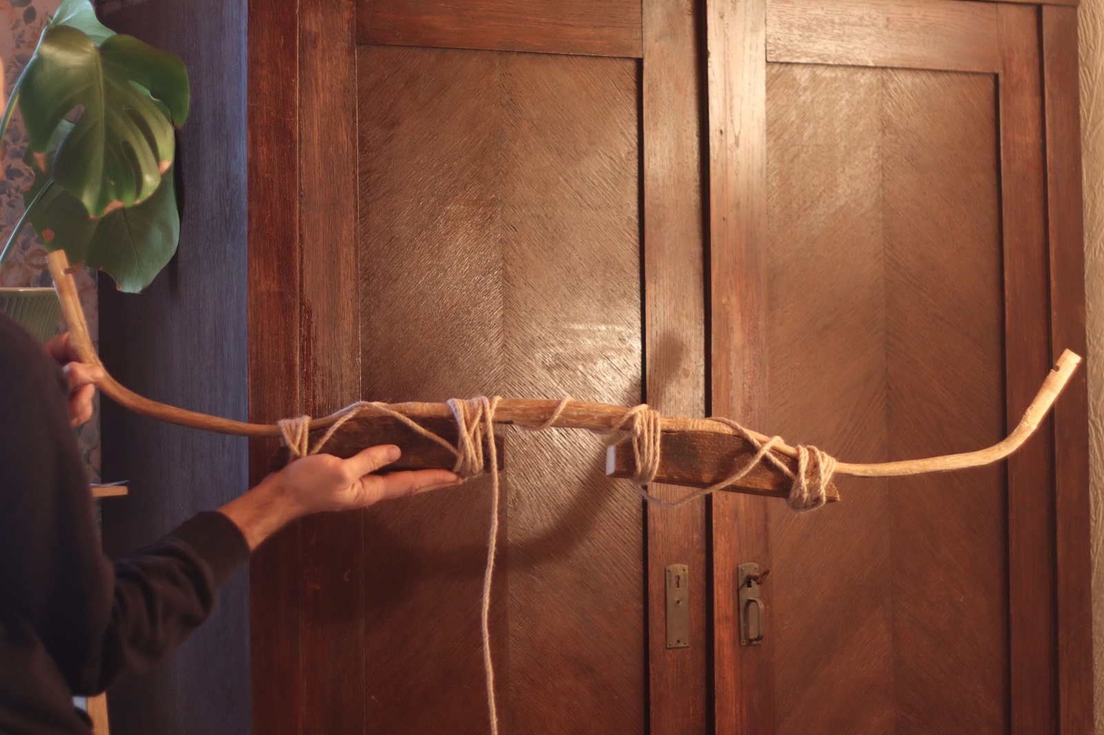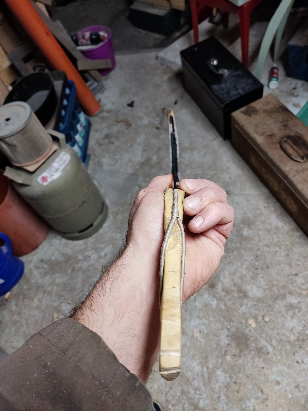 Aus Angst durch noch mehr Hitze mehr Schaden als Nutzen zu haben, habe ich einfach angefangen zu tillern. Ausziehen ließ sich der Bogen, auch ohne dass die Sehne runtergesprungen wäre. Mitte Februar hatte ich den Bogen dann endlich auf dem Tillerstock.