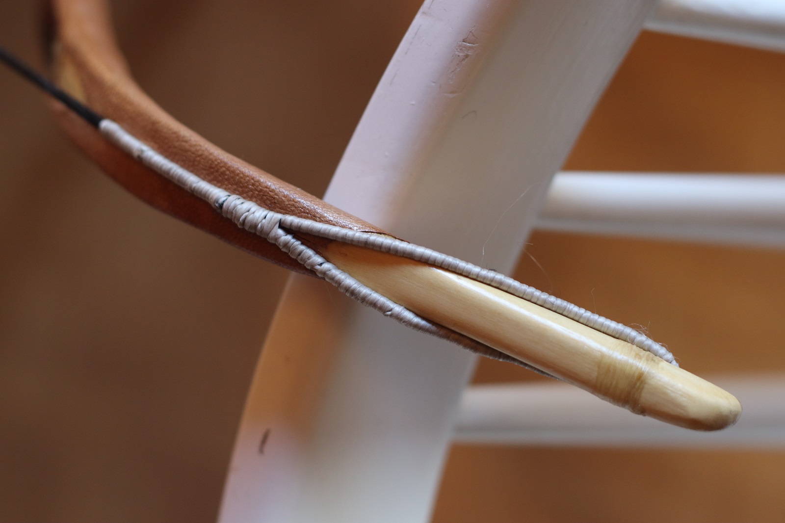 Trotzdem hab ich den Bogen aufgespannt und unter den aufgerichteten Span etwas heißen Hautleim gespritzt, danach straff mit Zwirn umwickelt.