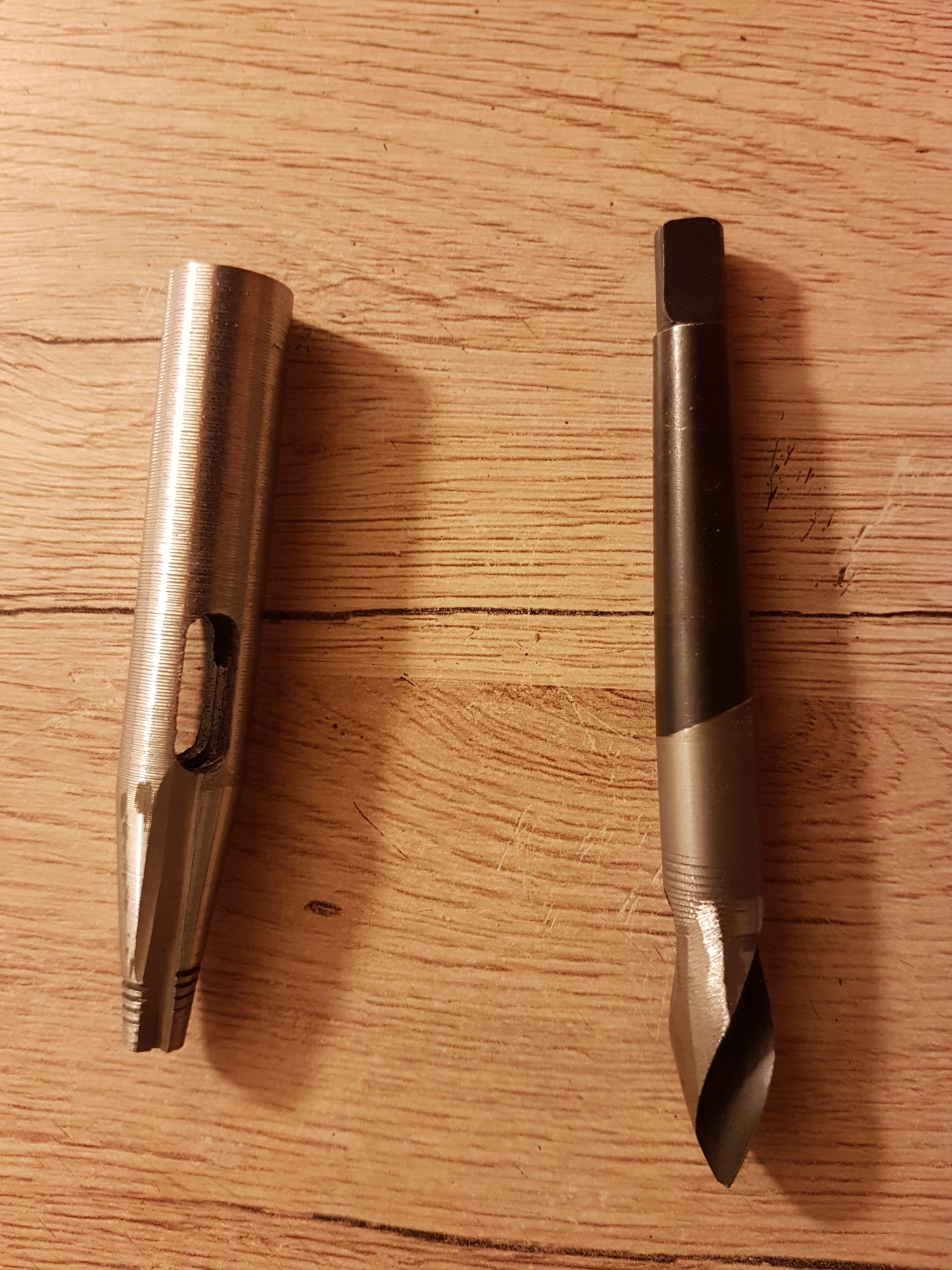 Das ist einfach ein Bohrer mit Morsekegel und eine Morsekegel- Reduzierhülse. Der Bohrer ist stark gekürzt und etwas angespitzt, dass er so zu sagen im Holz ausläuft und nicht mit einer geraden Kante endet. Ebenso ist die Reduzierhülse etwas angespitzt um genau so einer Sollbruchstelle möglichst vorzubeugen. Diese beiden Teile sind mit Epoxy in die Löcher im Griff geklebt. Die Stellen, an denen ich besonders hohe Belastung erwarte habe ich dann mit Mittenwicklungsgarn gewickelt. Die Verbindung ist nach einfachem zusammendrücken nicht mehr von Hand zu lösen. Durch das Loch drücke ich die Teile mit einem Schraubenzieher wieder auseinander.
