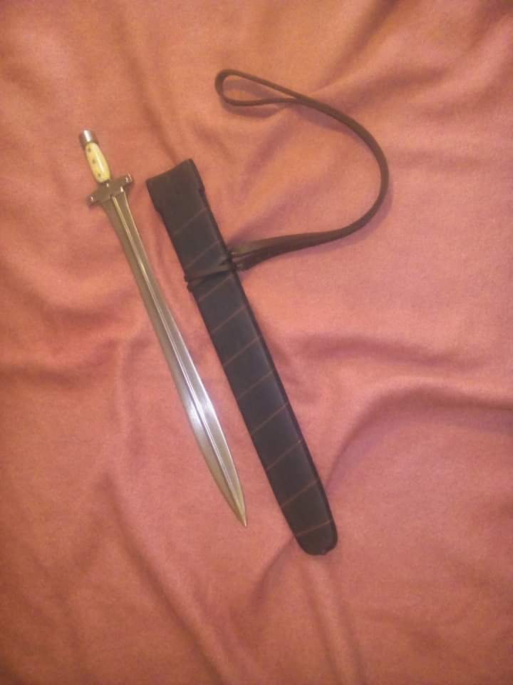 Vor allem mal ein Schwertgehänge ohne Nieten und Metallbeschläge sondern nur gewickelt und geknotet. Hat mich einiges an Nerven gekostet bis das alles passte, aber hält wenn man es mal raus hat bombenfest.