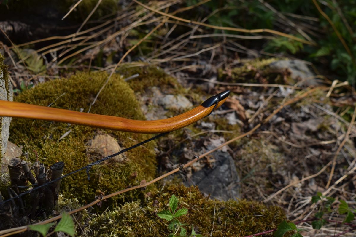 ich bin auch mal wieder dazu gekommen, was abzulichten, bevor es weg ist. Klassischer Osage-Rcurve mit recht zahmen 35lbs@28". Die Griffform ist diesmal etwas anders als üblich, die hat quasi das Holz diktiert. Ich konnte auch mal die Geschwindigkeit messen, die liegt bei 162 fps mit einem 10 Grain/lbs-Pfeil. Damit bin ich für einen 35 Pfund-Bogen ganz zufrieden.