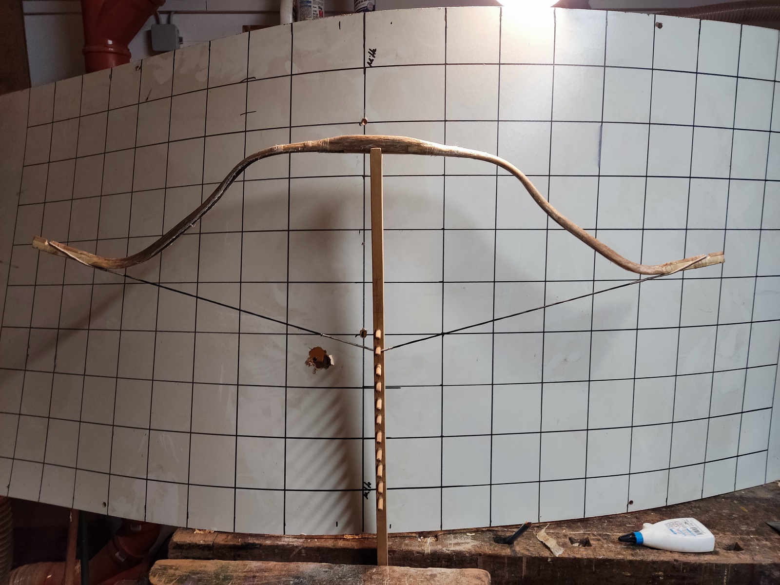 Aus Angst durch noch mehr Hitze mehr Schaden als Nutzen zu haben, habe ich einfach angefangen zu tillern. Ausziehen ließ sich der Bogen, auch ohne dass die Sehne runtergesprungen wäre. Mitte Februar hatte ich den Bogen dann endlich auf dem Tillerstock.