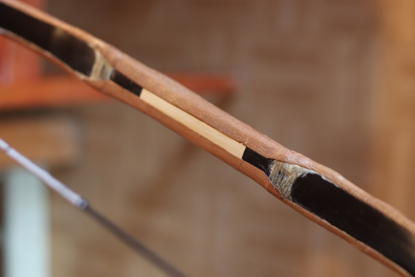 Beim ersten schießen hat dann allerdings der Sehnenbelag eine Schwachstelle gezeigt und sich ein 1cm breiter Streifen aufgerichtet und einen Riss ins Leder gemacht.