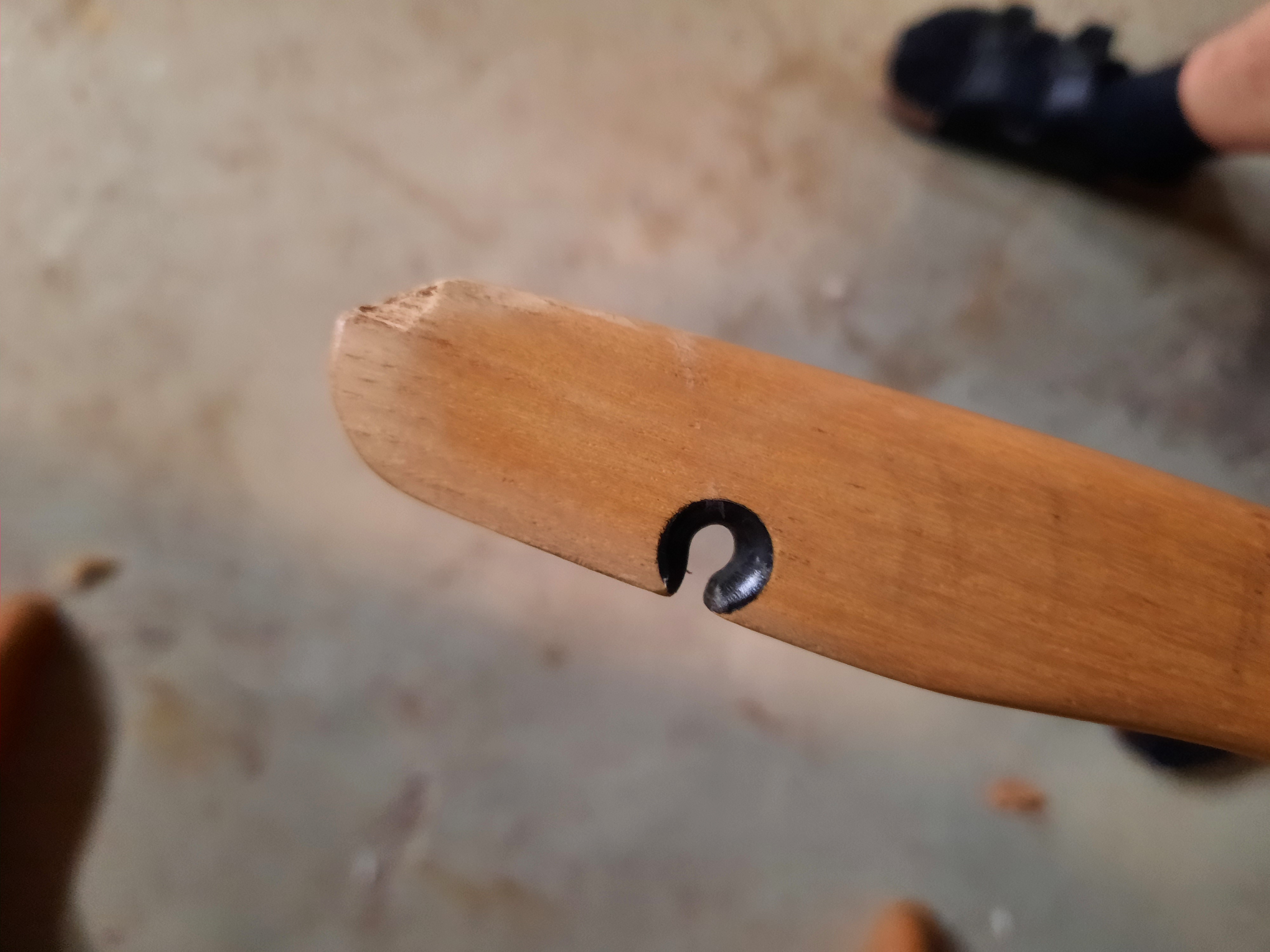 Die Abplatzung an der Nockkerbe wie vom Raben beschrieben flicken und dann beim Schleifen gleich den oberen Zentimeter vom Siyah mit abschleifen und neu formen bzw schön schleifen.