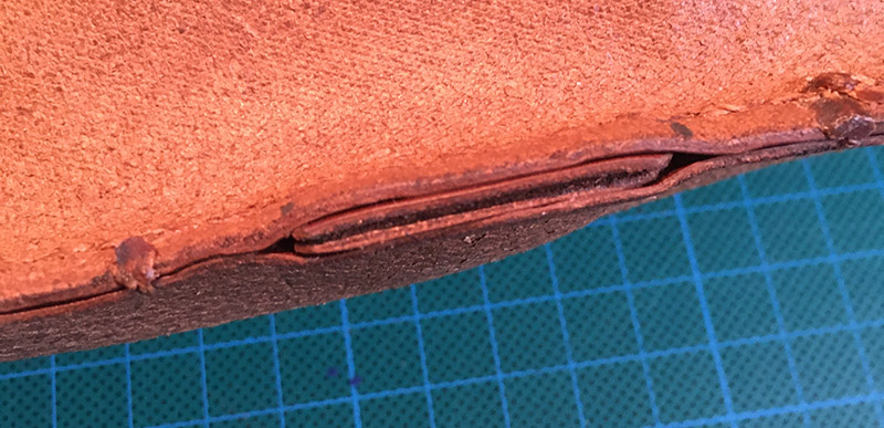 Mein Problem: Da die Röhre mit Boden bereits vernäht ist kommt ich von innen gerade so mit der Hand an diese Stelle und bin so gut wie nicht in der Lage die vorgestochenen Löcher mit der Nadel von innen zu finden. Die schöne Lederseite hab ich mir wahrscheinlich auch schon zerkratzt bei dem Versuch. Ohne Vorstechen schaff ich es nicht durch das Leder. Eine gebogene Nadel hat leider auch nicht besser funktioniert, da das Schlaufenteil nur 3 cm breit ist, die Stiche als 5 mm weit auseinander.