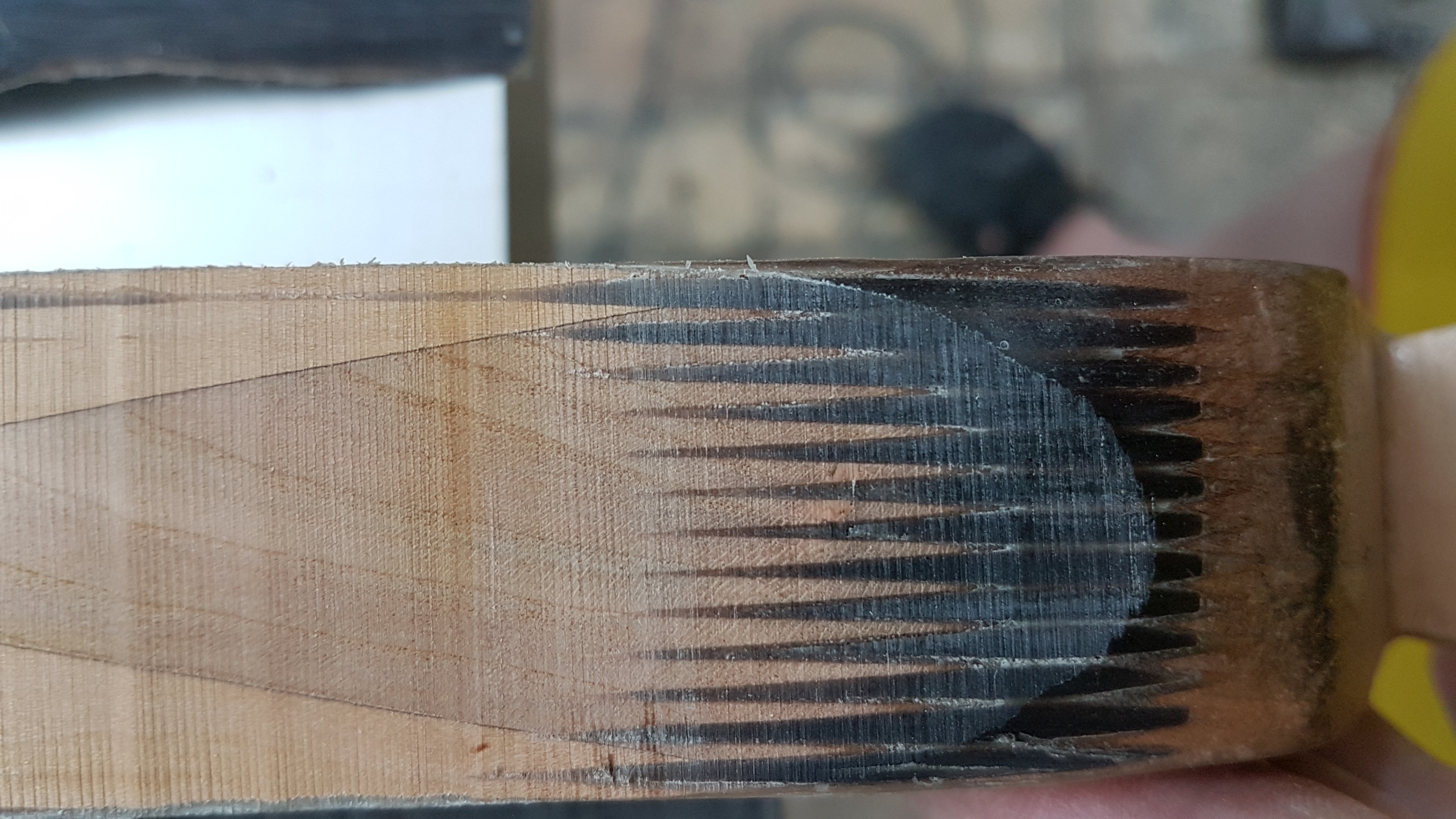 Ich werde jetzt den Rahmen bauchseitig abschleifen und Horn mit Epoxid aufkleben. Der Bogen ist zwar recht schmal mit ca. 35 mm, aber dafür ist Kern und Sehnenlage gut und viel zu schade um das Konstrukt komplett zu verwerfen.