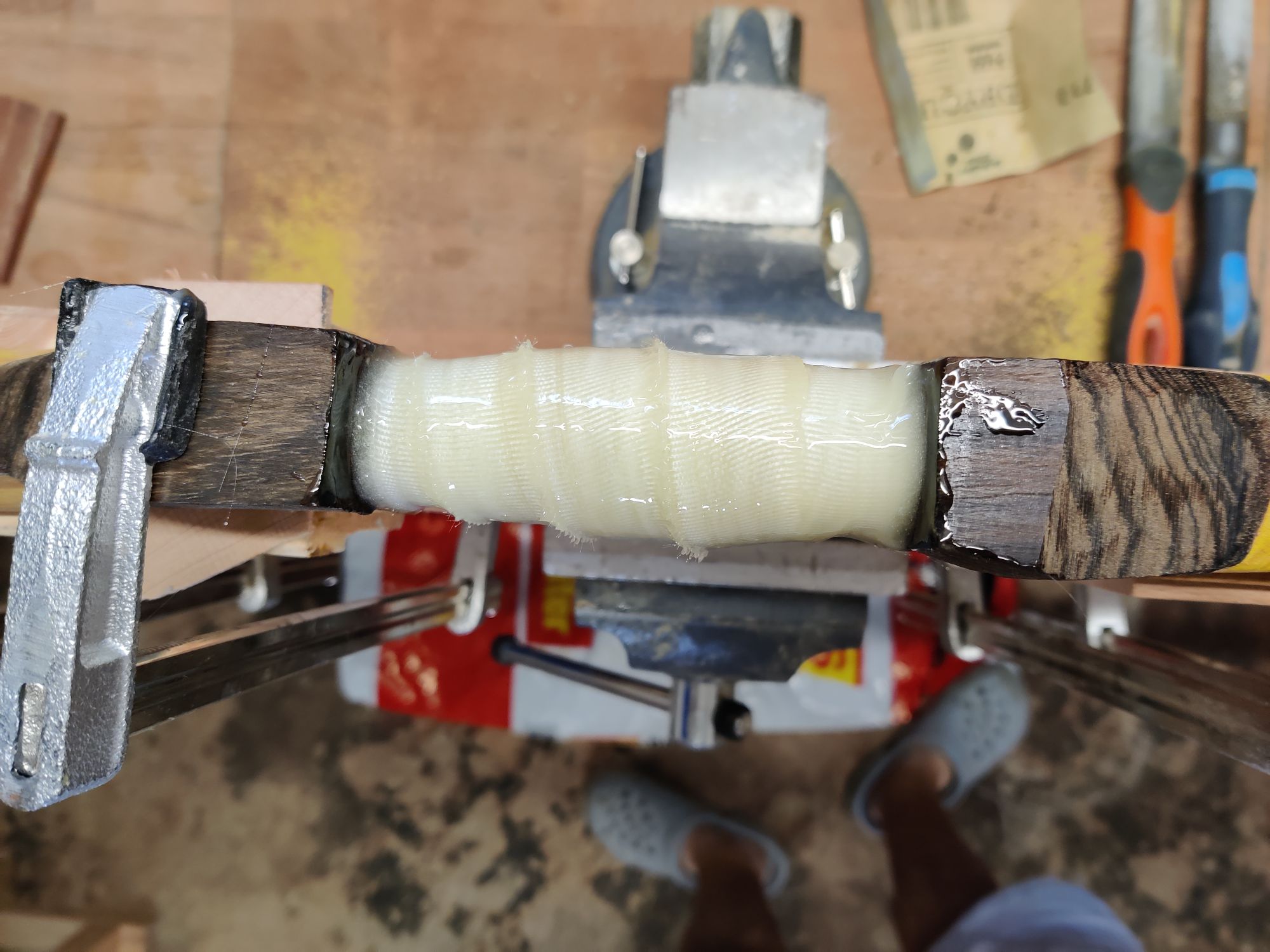 Vor 2 Monaten hat Clay Hayes eine neue Methode (zumindest kannte ich sie noch nicht) für die Herstellung einer Takedown-Verbindung veröffentlicht. Im wesentlichen werden die beiden Wurfarme im Griffbereich ähnlich wie bei einer Verbindung mit Metallhülsen vorbereitet und dann mit, in Epoxidharz getränktem Glasfaserband umwickelt. Dabei ist darauf zu achten dass der untere Wurfarm konisch gefertigt und fein geschliffen ist, sowie mit Entformungsspray besprüht wird. Die Vorteile bestehen darin, dass der Griff frei Formbar ist und man nichts von der Verbindung erkennen kann.