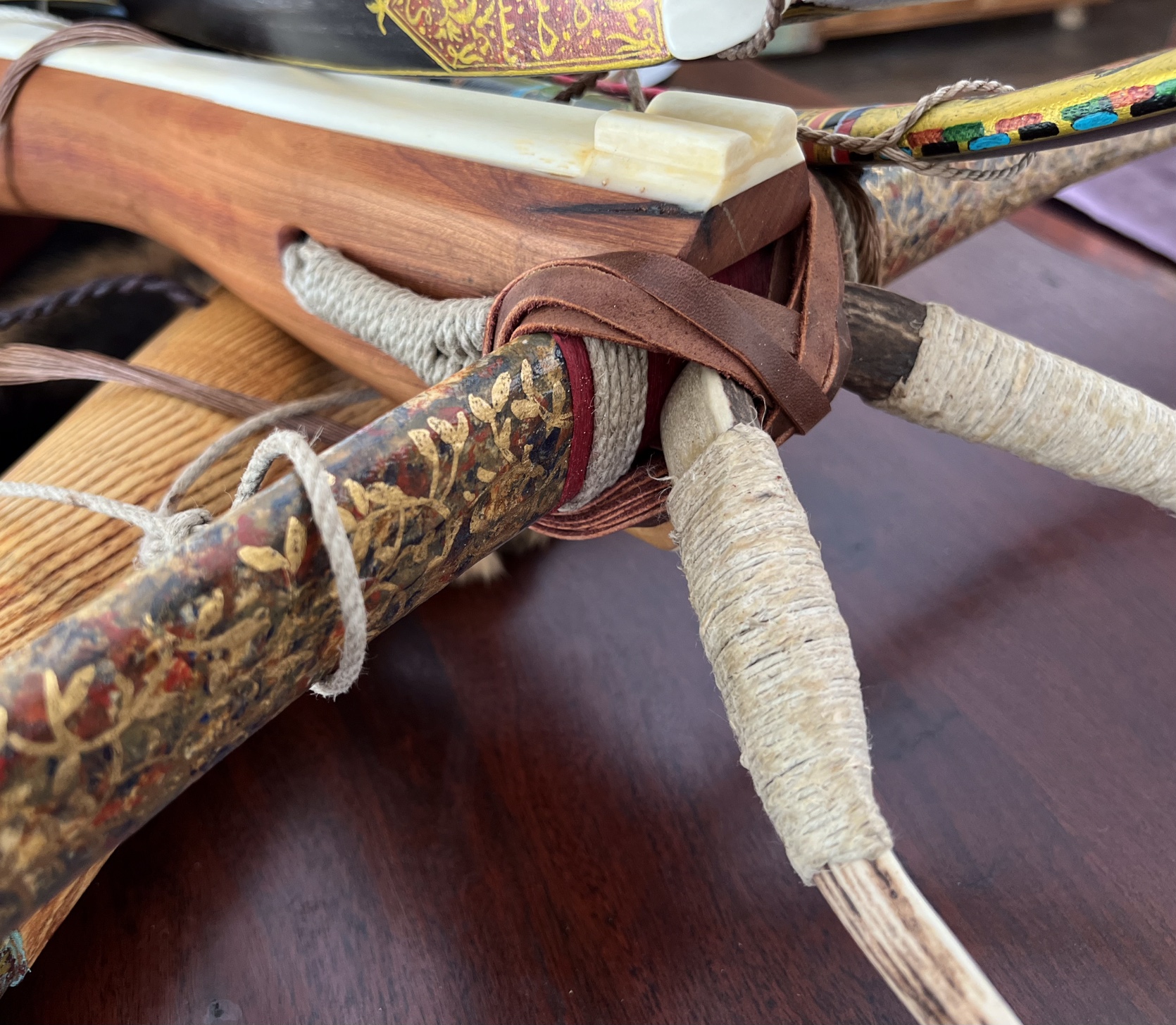 Zwetschkenholz, Knochenplatten, Wasserbüffelhorn, Hirschhorn, Hirschsehnen, Hirschrohhautbacking, Leinenfaden gewachst 1mm