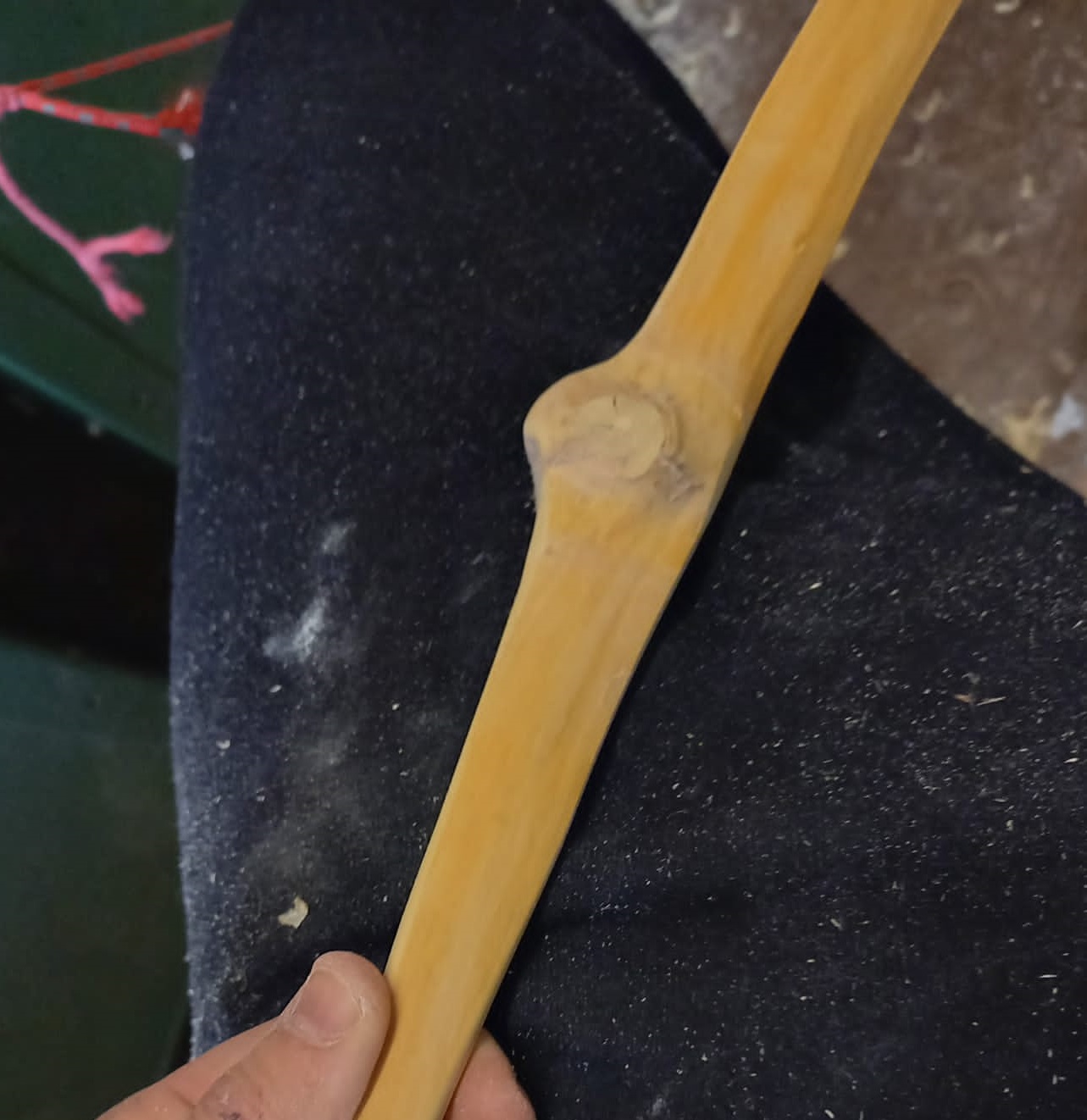 Hier ein paar Bilder: um das gigantische Astauge (1cm Durchmesser) mit den vielen Rissen musste auf jeden Fall wieder ne Wicklung mit 2K. Hier beim prüfen des alten Tillers sieht man, dass er am rechten WA zwischen F und G bereits leicht knickt Im nächsten Beitrag dann der Bogen danach, sonst wirds hier zu unübersichtlich