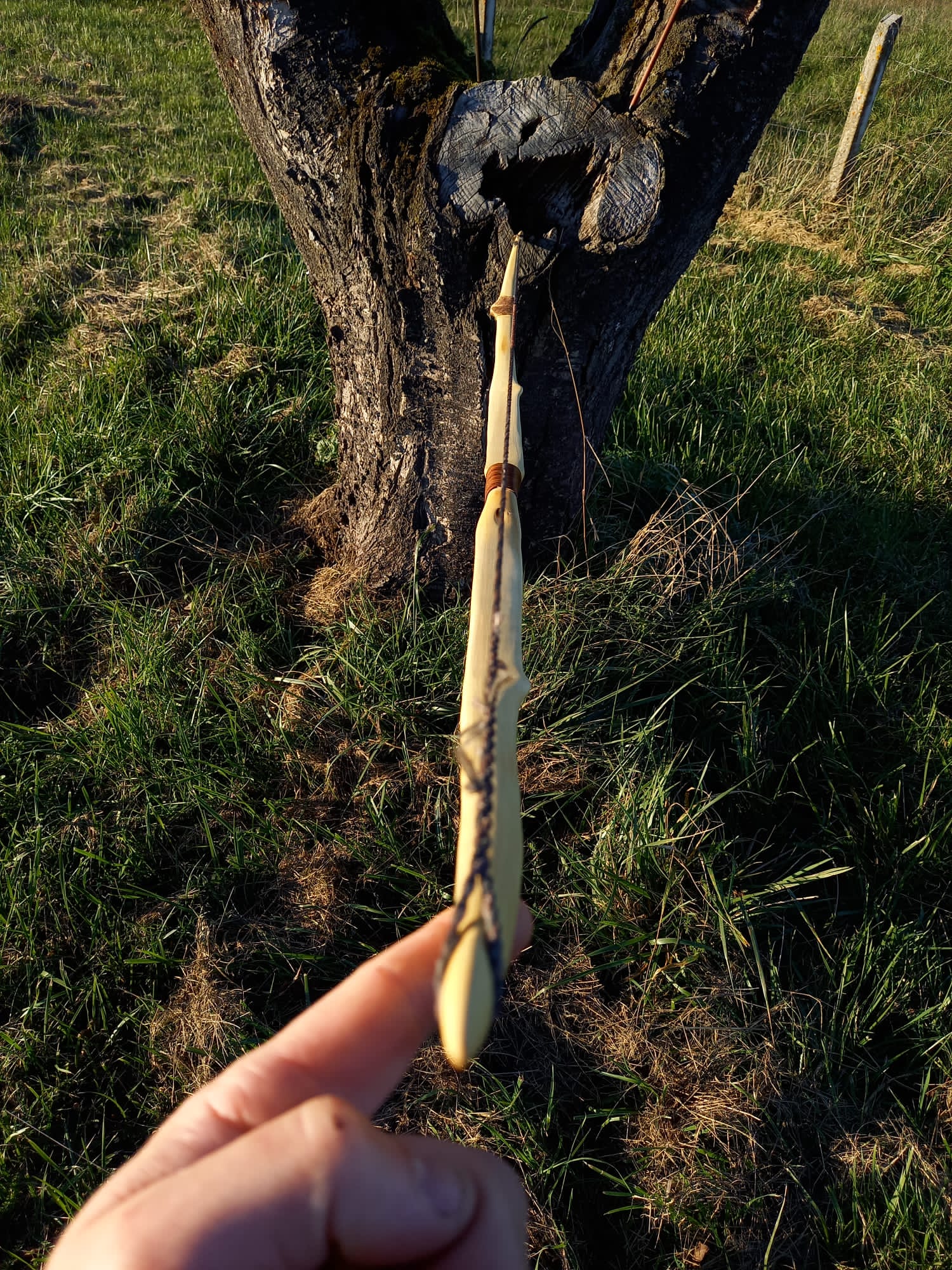 Hier ein paar Bilder: um das gigantische Astauge (1cm Durchmesser) mit den vielen Rissen musste auf jeden Fall wieder ne Wicklung mit 2K. Hier beim prüfen des alten Tillers sieht man, dass er am rechten WA zwischen F und G bereits leicht knickt Im nächsten Beitrag dann der Bogen danach, sonst wirds hier zu unübersichtlich