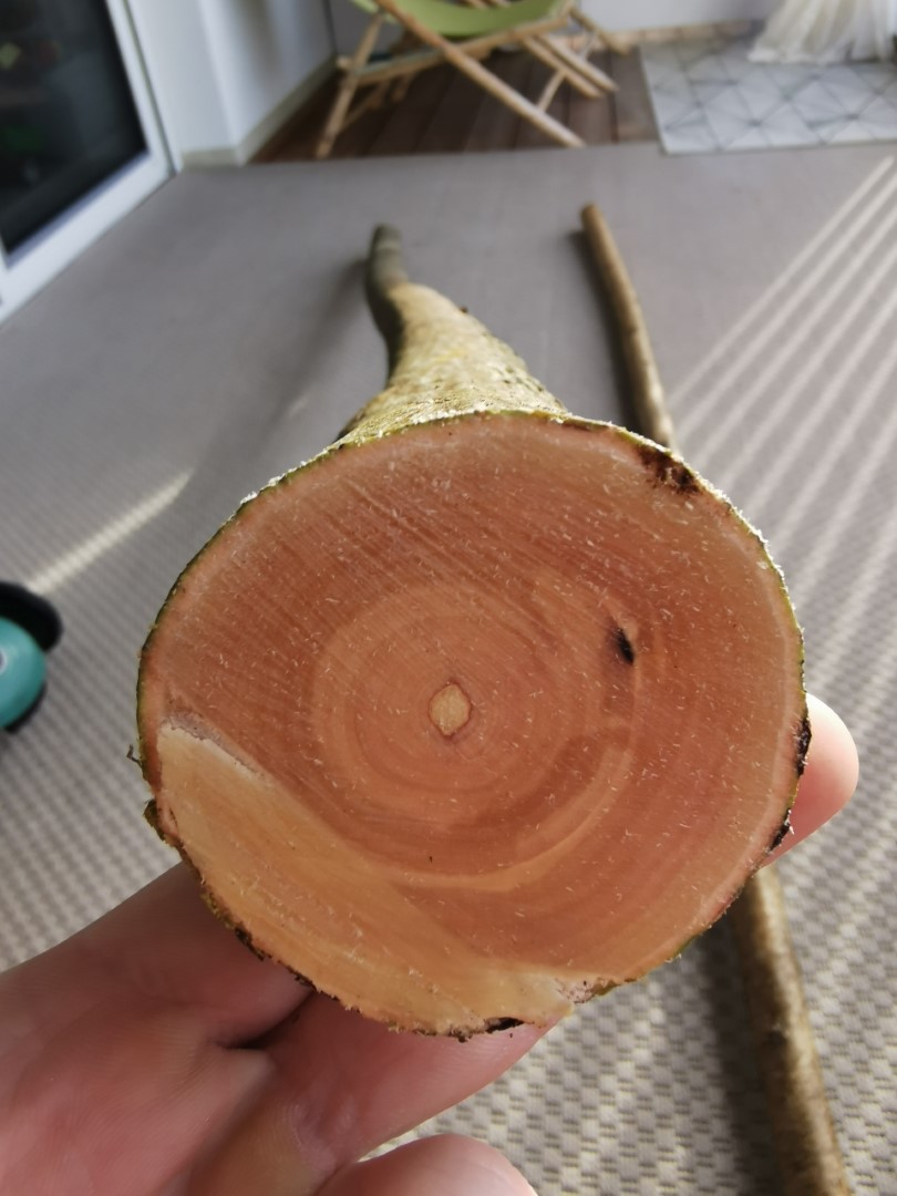 Mein Ziehmesser ist ja eh noch nicht eingetroffen, daher lass ich die jetzt noch ein bisschen auf dem Balkon liegen und sobald es da ist arbeite ich schon mal den Hasel grob vor. Ich hab mir gestern noch die Videos von Adamusminor angesehen und ich versuchs dann so wie er mit der Hasel. Wenn er sich verdreht muss ich mir eben einen neuen holen.