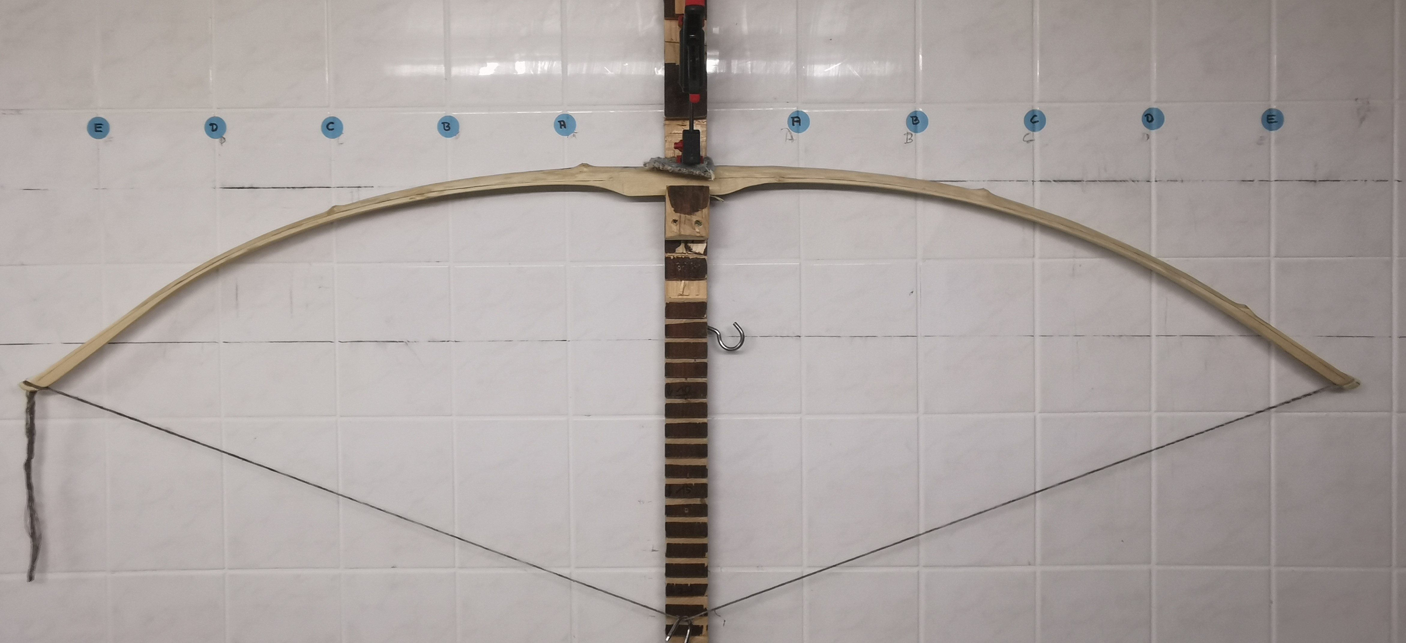 Ich habe den Bogen so aufgehängt, dass die Sehne auf Standhöhe waagerecht ( in Flucht mit der Fliesenfuge ) hängt, und dann beim Auszug darauf geachtet, dass die Tips sich gleichmäßig senken. Wo liegt mein Fehler?