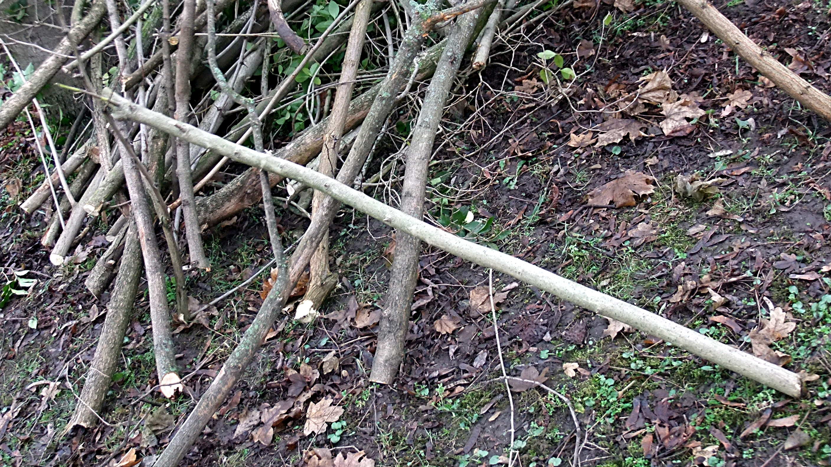 So, ich war ungeduldig und habe den zweiten Kandidaten gefällt, einen Tatarischen Hartriegel (cornus alba), 154 cm lang und so um die 3 cm dick (unten etwas mehr, oben etwas weniger). Hatte ich noch nie, ich habe aber läuten hören, man könne da keine Bogen draus bauen. Was ich weiß, ist, dass das Holz weniger dicht ist als die beiden oft verwendeten Hartriegel (so um die 0,6g/cm²), also wird es wohl weniger Druck aushalten. Das Stämmchen steht noch im Freien.