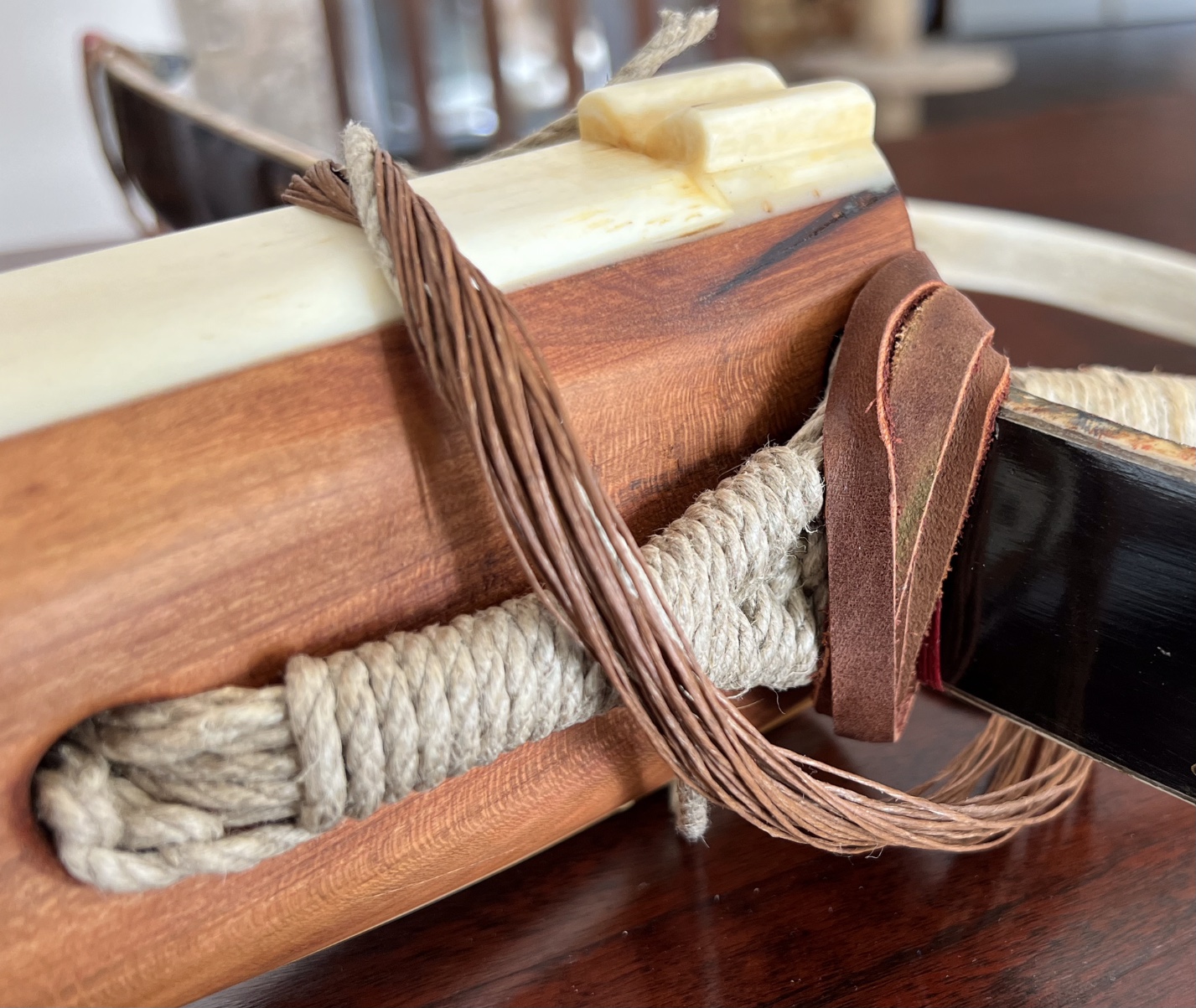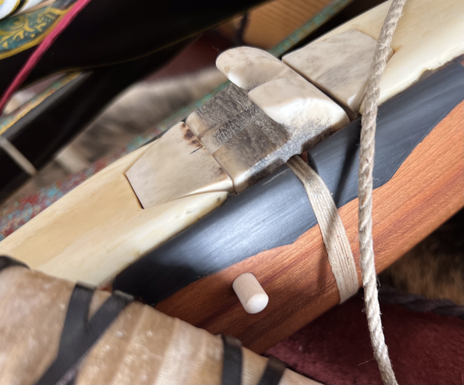 Zwetschkenholz, Knochenplatten, Wasserbüffelhorn, Hirschhorn, Hirschsehnen, Hirschrohhautbacking, Leinenfaden gewachst 1mm