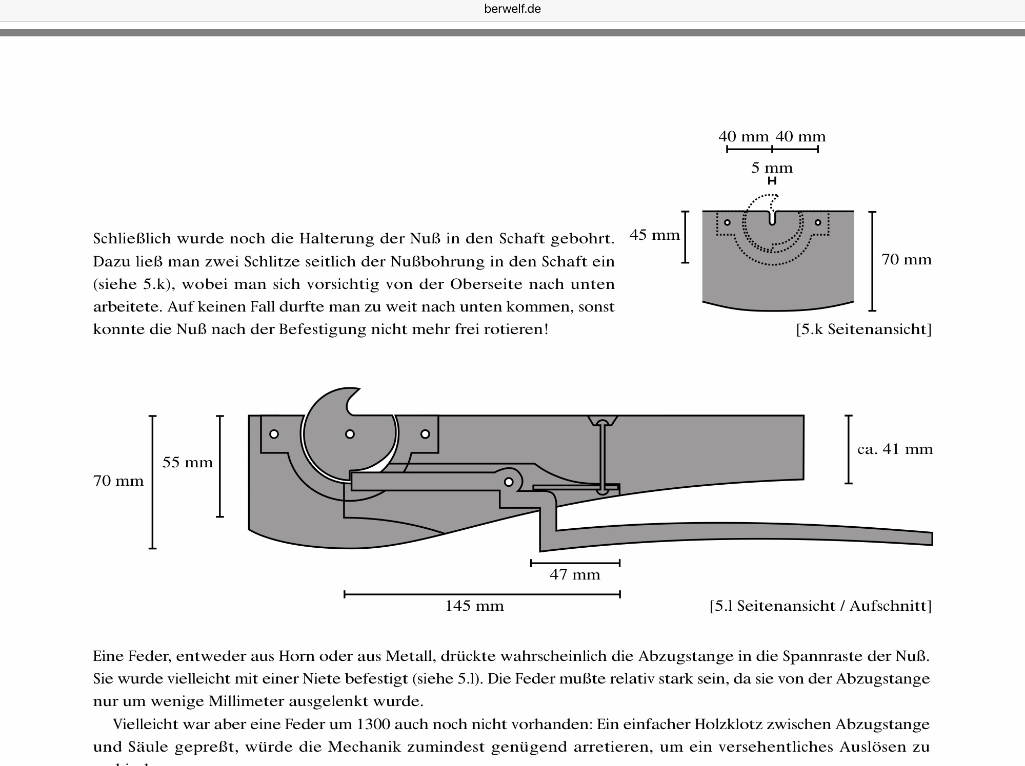 Es handelt sich um eine Hornbogenarmbrust um ca. 1300n.C.. Damals wurde tatsächlich die Nuss nicht mit einem Bolzen eingesetzt. Die Nuss rotiert frei im Nussbrunnen, Beim Einbau kann aufgrund des über die Mitte geschnittenen Nussbrunnenlagers, die Nuss nur von der Seite eingeschoben werden. Von oben geht nicht. Dann wurde der Nussbrunnen mit der Nuss in die Kammer im Holzschaft eingesetzt und der Nussbrunnen mit Hornstiften gesichert. Die Nuss wurde mit Talg geschmiert und der Nussfaden diente der zusätzlichen Sicherung. Alles wieder einfach demontierbar. Beim einachsigen Schloss drückte tatsächlich eine Hornfeder den Abzughebel ins Schloss. Der Abzughebel selbst war anfänglich auch aus Geweihteilen zusammengeklebt. Erst später wurden immer mehr Metallteile verwendet. Bei über 1200 Pfund Zuggewicht fürchte ich, wird dir sonst irgendwann alles um die Ohren fliegen.