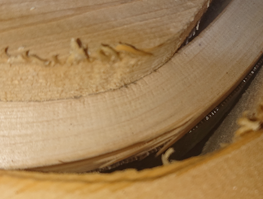Schön zu sehen wie sich Späne abheben wo das Sägeblatt zu schmal ist..