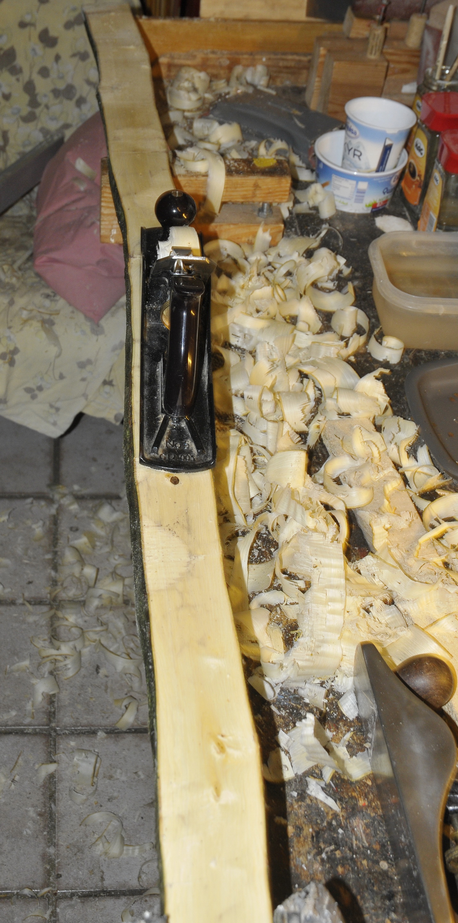 Danach etwas mit dem Hobel begradigt und später die Enden noch etwas reduziert auf 1,5 cm, da die Hanbuche trotz HLP nicht biegen wollte.