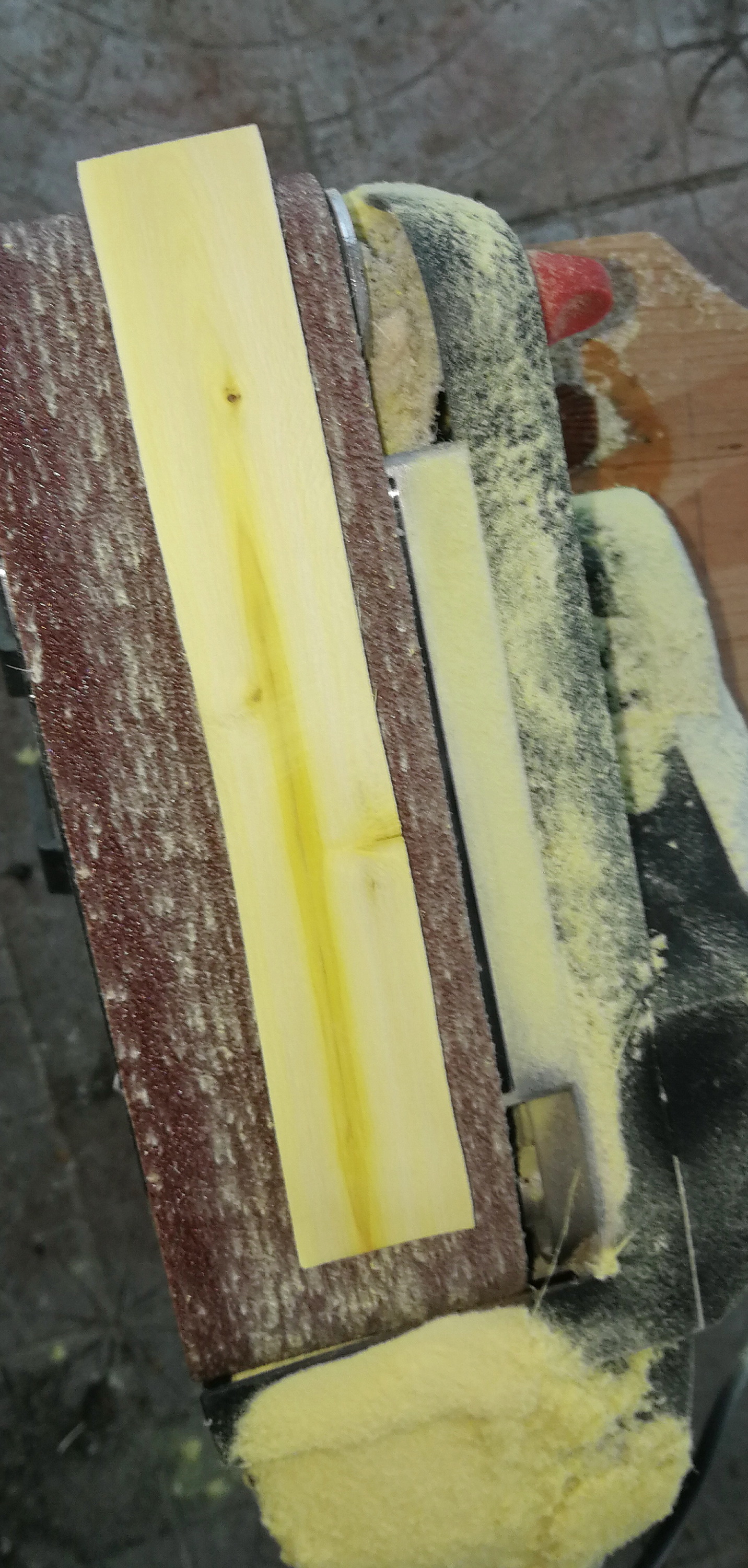 Ich habe heute auch wieder Späne gemacht, das Haselfacing mit dem Bandschleifer grob getapert, gewölbter Rücken etwas schwierig, die Berberitze für den Griff geschliffen und dann das ganze mit Epoxy verklebt. Wollte zuerst mit Fahrradschlauch wickeln ging aber nicht gut, Spalten zu groß. Deshalb rasch auf Zwingen gewechselt was etwas chaotisch wurde.
