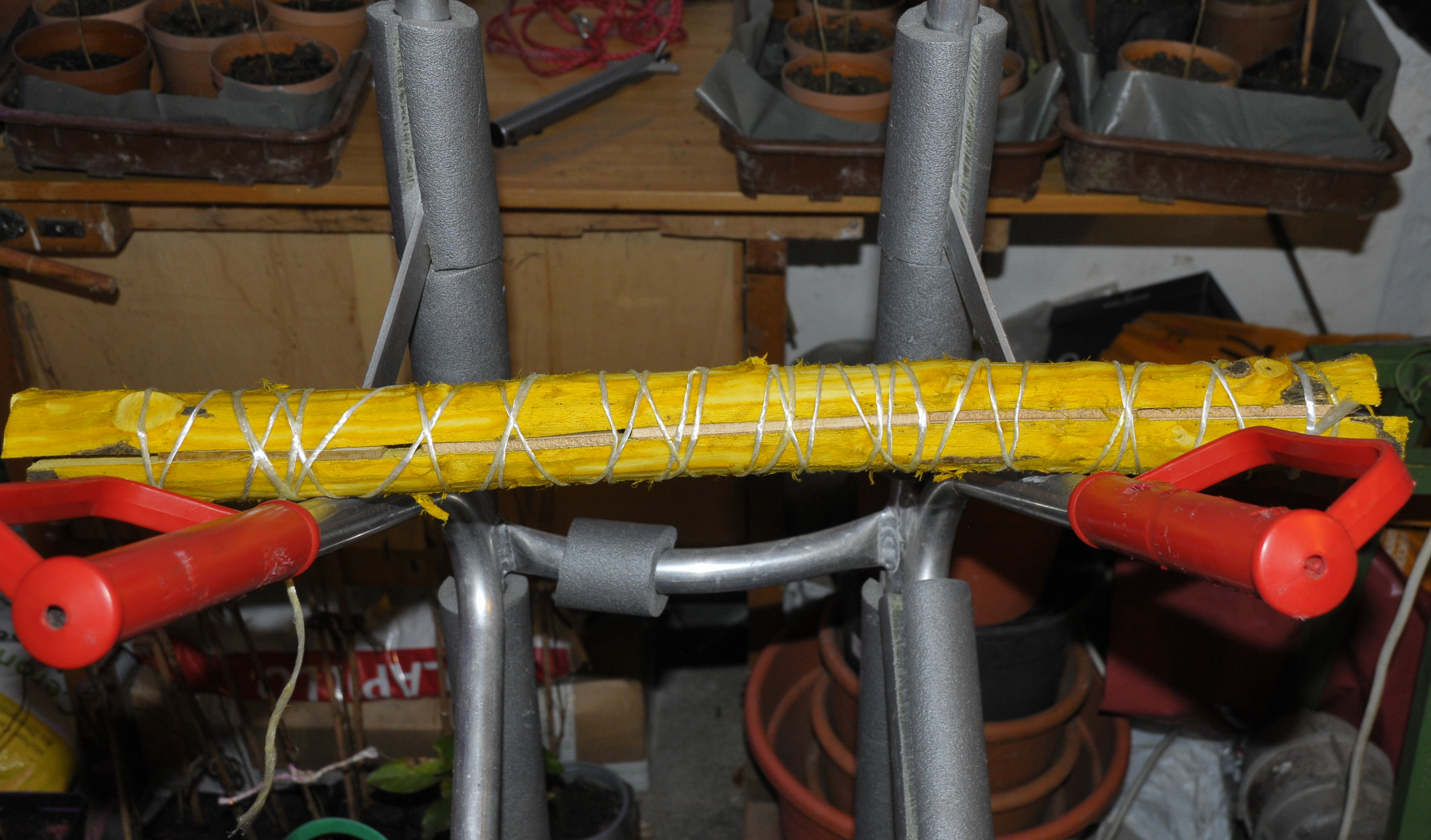 Die andere Hälfte des Hasels hab ich Reflex auf ein Brett gespannt als Reserve (Spare) falls der Hasel/Hainbuche nicht will.