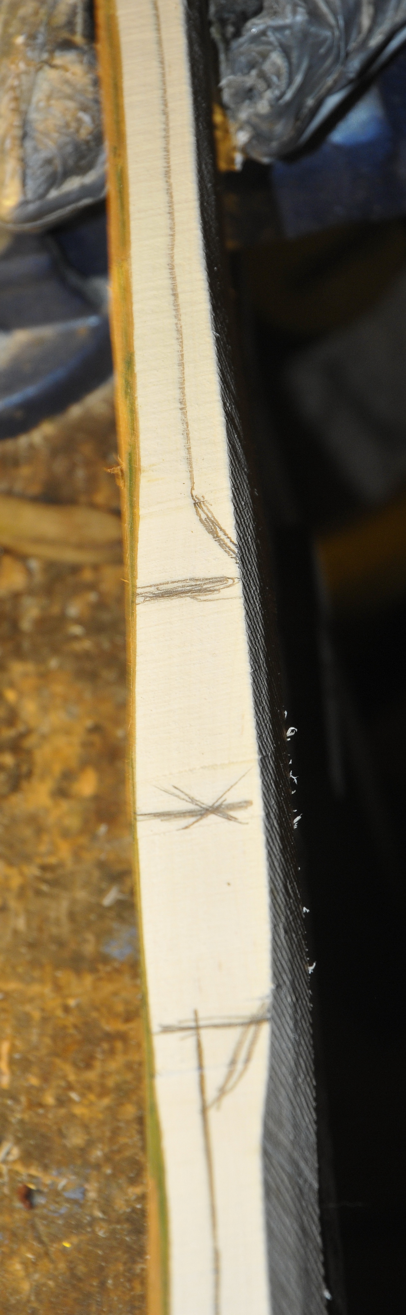Der Hasel am Rücken war zu stark, 8mm, da ist jetzt von der Hainbuche schon fast nichts mehr übrig deshalb hab ich momentan keine Lust weiter zu machen, den Fehler mit dem zu dicken Hasel kann ich nicht mehr ausbessern. Das Hasellaminat hätte deutlich dünner sein müssen, so um die 4 bis 5 mm.