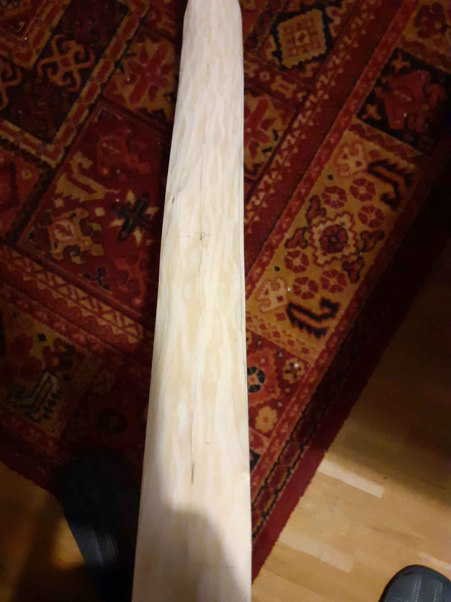 Bis jetzt nur eine Latte mit Dicken-und Breitentaper und ner Einschnürung in der Mitte auf dem Weg zu nem Propellerbogen o.Ä. ;D Maße bis jetzt 12-19-28-19-12mm Dicke,17-42-48 ("FO")-32-48("FO")-42-17mm Breite. Da geht noch gut was weg,der fühlt sich im Bodentiller trotz Restfeuchte noch an wie 90# ::) .