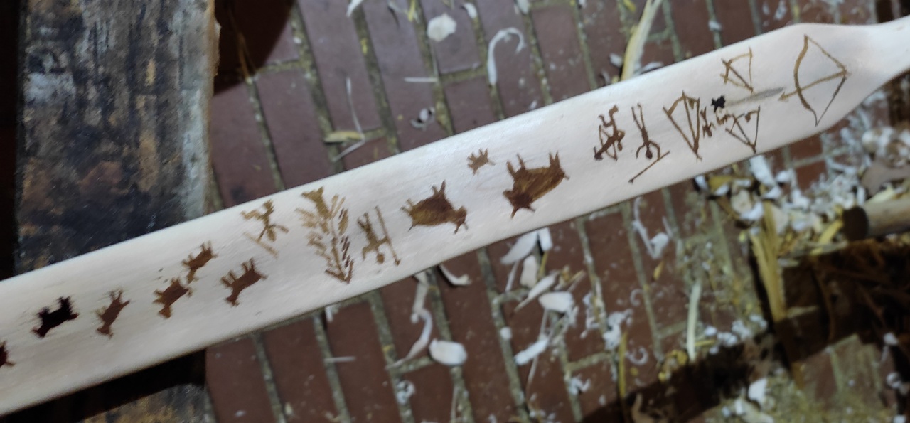 Heute Abend ging es weiter, Tips geformt, Arrowpass. Und dann habe ich meine Idee umgesetzt, mit Beize (Kaliumpermanganat) Bilder im Stil steinzeitlicher Höhlenmalereien auf den Bauch zu malen. Weil ich zu faul war, einen Pinsel von drinnen zu holen, habe ich einen Federkiel genommen. Das ging hervorragend und das Malen hat total Spaß gemacht. Sogar das Logo kann man damit anbringen. Hier Mal nur ein paar Bilder, am Handy ist Beitrag erstellen mühsam. Hoffe, das Hartöl für die Versiegelung verwischt es nicht. Achja, Zuggewicht bei 28" AMO 64,8# gemessen.