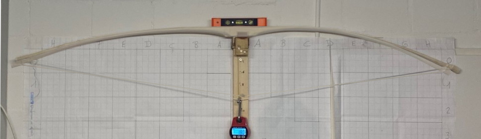 Entspannter Bogen ohne Sehne (geruht über Nacht) Der Bogen mit schmalen Enden auf Standhöhe (13.5cm) - ohne Waage eingehängt Auszug 8 Zoll - 7.8# Auszug 10" - 13# (gestern 13.6) Auszug 12 " Auszug 14" Auszug 15" - 24.4# Auszug 16" Nach meinem Auge besteht beim rechten WA noch der "Knick" bei C-D, auf BEIDEN WA sind die Bereiche G-H noch sehr steif.