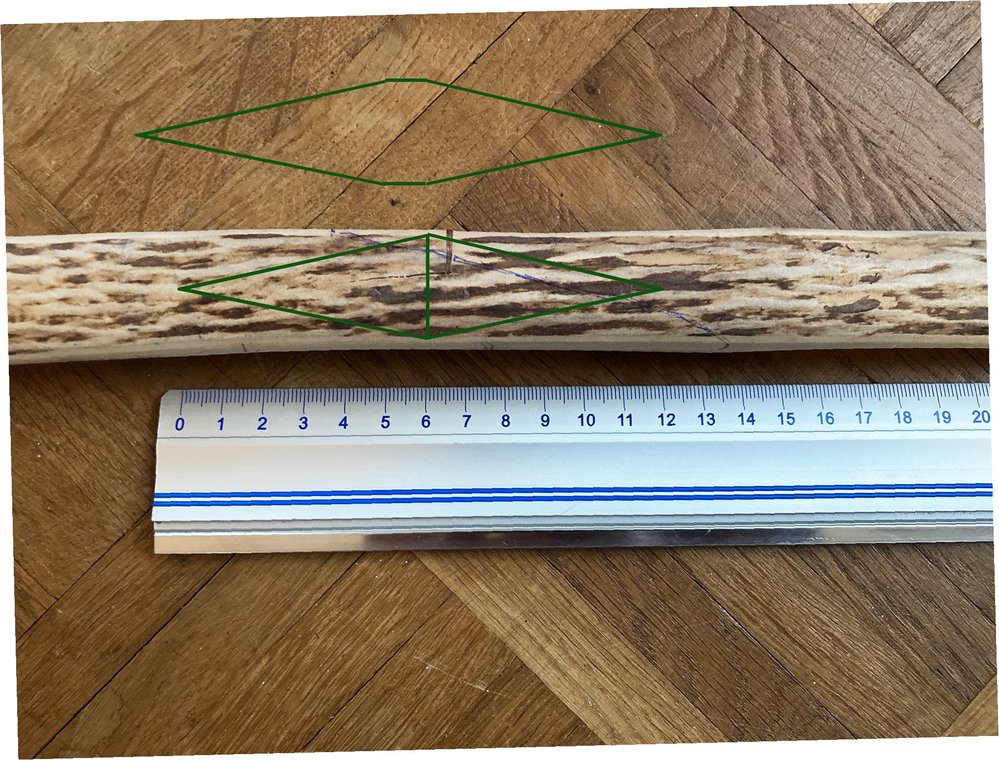 Ich würde es mir ganz einfach machen. Bauchseite bis auf den markkanal runter hobeln und ein Stück Holz aufkleben. Auf den Rücken 1-2 Lagen Leinen Stoff o.ä. auflaminieren und gut is... Zugegeben, optisch nicht der Bringer, aber zumindest für mich deutlich einfacher als einen schrägen Spleiß zu machen oder einen Keil einzupassen...