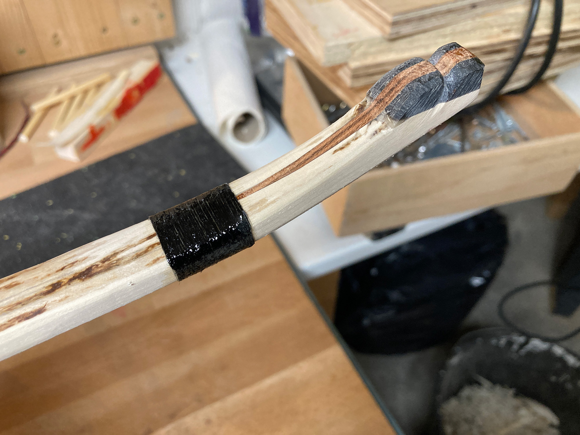 Ich habe mich für Neumis Vorschlag entschieden, weil dabei gleichzeitig die gebogenen Bereiche stabilsiert werden und das ganze mit dunklem Holz ausgefüht. Bisher hält es und biegt sich auch schon! Die Tips sind noch recht grob und schwer, ich habe zur Sicherheit eine Tiller- und Übungs-Wicklung angebracht, die für das Gestalten und Verschlanken der Tips am Ende nochmal erneuert wird.