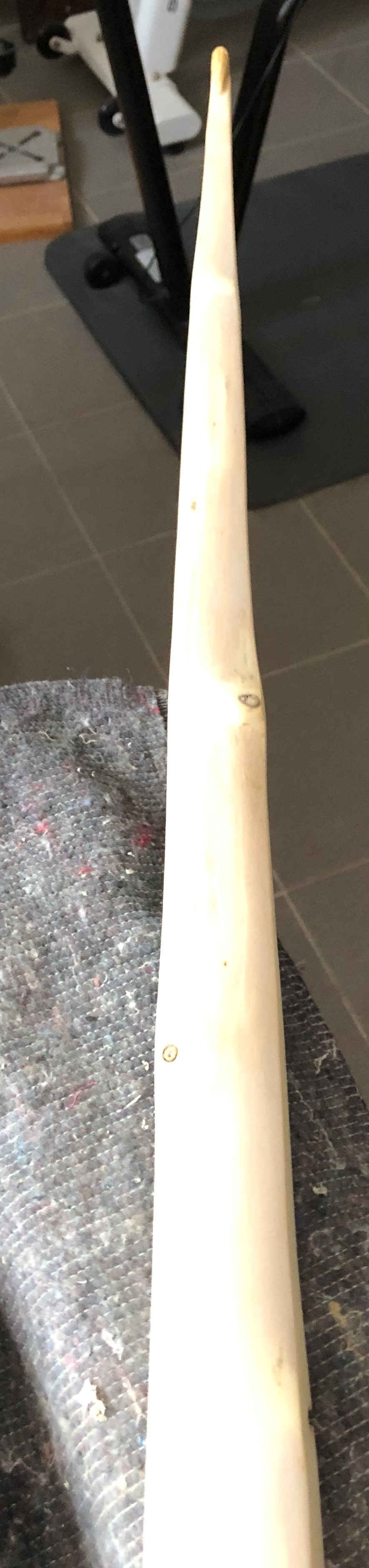 Die Rohform hat das Holz bereits verpasst bekommen, ca. 71,5 "" lang, vollpyramidal von ca. 4,5 cm an den Fadeouts auf ca. 1 cm an den Tips bei symmetrischer Bauweise (oberer und unterer Wurfarm sind noch nicht festgelegt).
