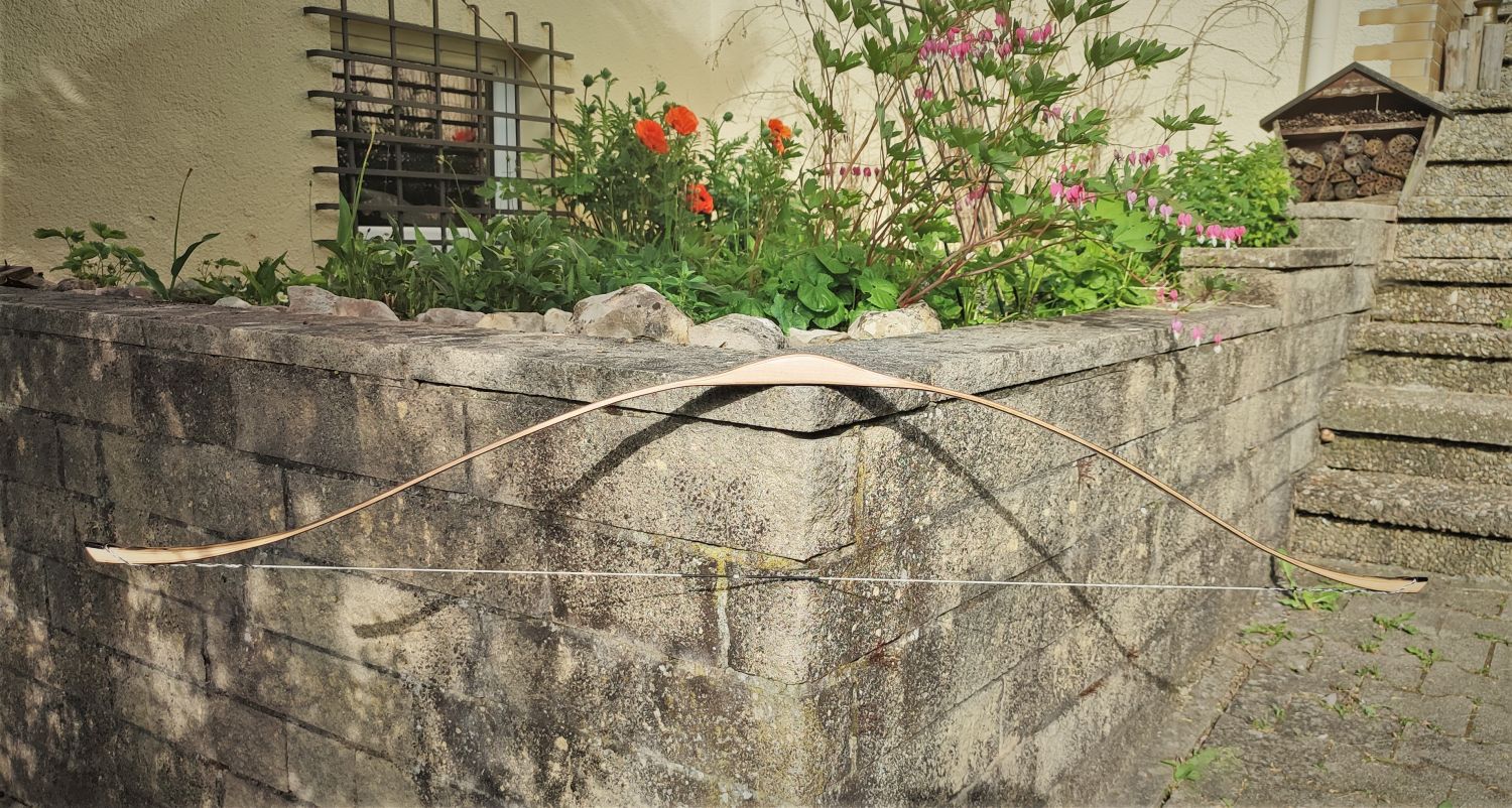 Der Bogen hat bei 28'' 90# und wurde beim tillern schmaler als ich wollte. Es sah alles soweit gut aus, bis das verwendete Kirschlaminat versagte und der Bogen übers Laminat platze. So legt ich den Bogen auf Seite und so lag er bis letzte Woche im Regal. Da ich weiter experimentieren wollte, nichts gerne weg werfe und das Glas auch ein paar Euro kostet, habe ich das Glaslaminat vom Holz getrennt( da ich 1mm Glas verwendete war das möglich) und alle Teile wie Griff und Tips neu geschliffen, damit ich es wieder verwenden konnte. So ist dieser upcircle Bogen entstanden. Die Herausforderung bestand darin, dass der Bogen geraden verleimt wird, da die Glasaminate schon in Form geschnitten waren. Auch konnte ich nicht mehr als zu viel tillern....