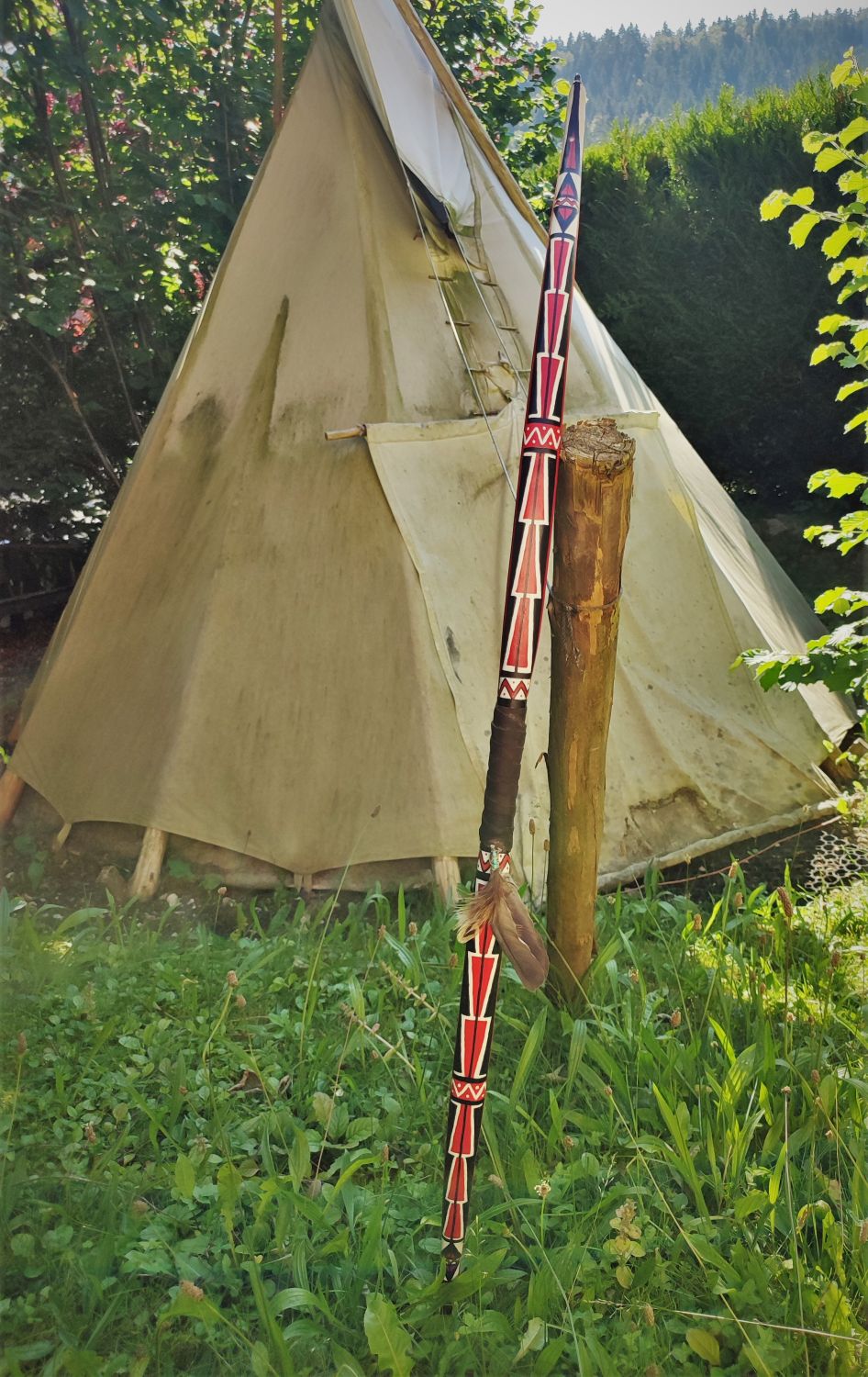 ein weitere Bogen verlässt meine Werkstatt. Er wurde aus einem Naturgewachsenen Ahorn Stave, mit Wasserbüffelhorn am Bauch und Straußensehnen auf dem Rücken hergestellt. Die Bemalung wurde dann auf der Rohhaut durchgeführt. Relfex war keiner gewünscht.
