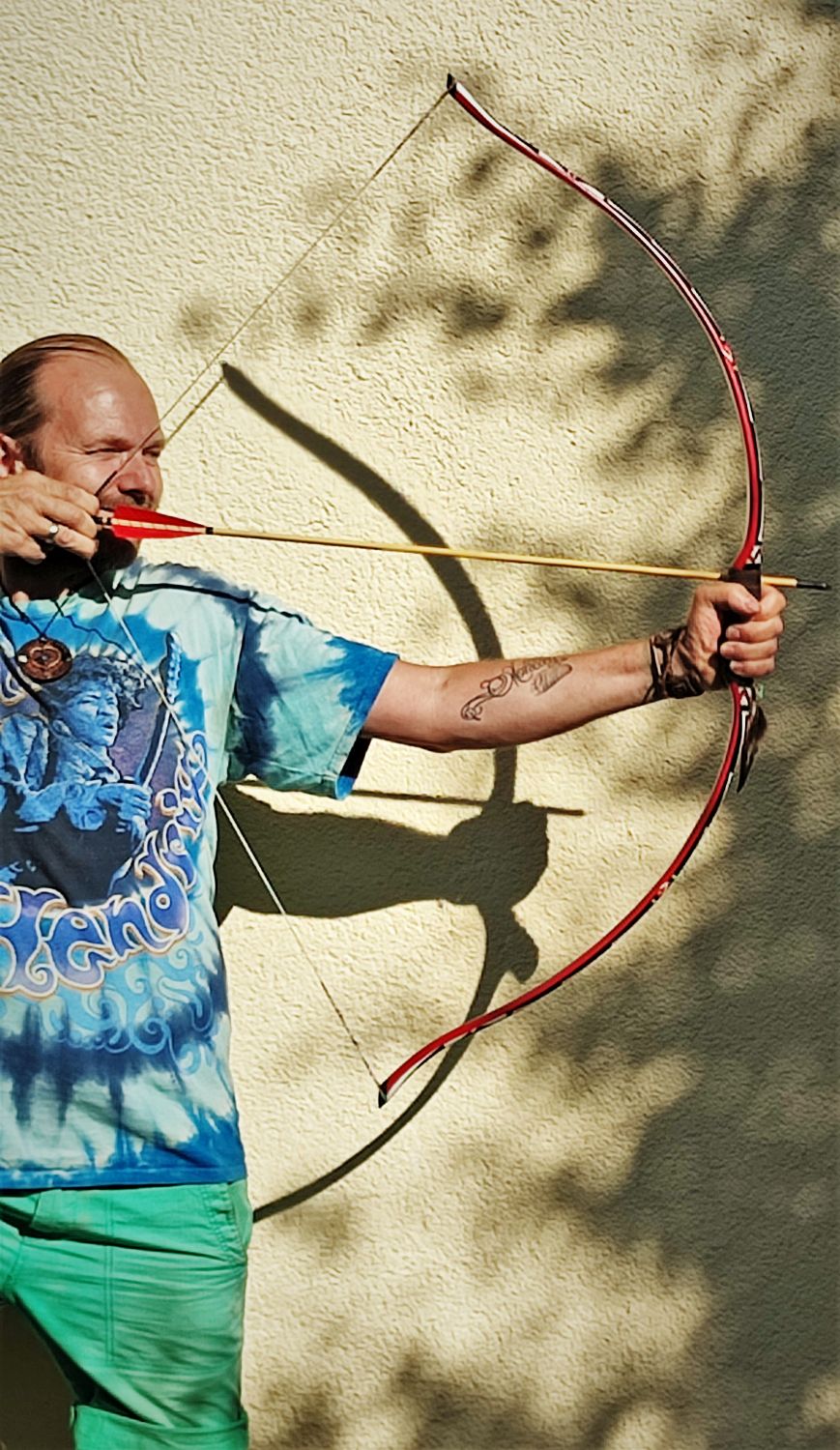 Super gelungener Bogen, ganz mein Bogentyp!, kurz, stressfreies Zuggewicht, Paddelbogen mit Horn und richtigem Griff! Der Griff und die Bogenlänge sind ja die Schwachstellen beim Hupabogen wenn man mediterran schießt (Ishistyle oder Yurok/Hupastyle Schießen geht ja ganz anders), das Horn ermöglicht den langen Auszug. Schöner positiver Tiller. Alles top, bleibt somit nur mehr das T-Shirt (bitte sieh‘s als running gag