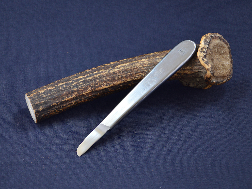 Einer meiner guten Freunde ist auch mein Zahnarzt. Also neulich rief mich mein Freund an: „Die Händler für medizinisches Zubehör führen eine bestimmte Art Messer nicht mehr. Ich habe dieses immer verwendet um Silikonabdrücke zu teilen und die Grate weg zu schneiden. Skalpelle sind zu dünn und empfindlich dafür und brechen immer aus der Halterung. Ich habe auf dem Mannheimer Maimarkt etwas gefunden was wie die früheren Messer aussieht. Die Klinge ist etwas kurz. Könntet Du diese verlängern und es auch scharf machen?“