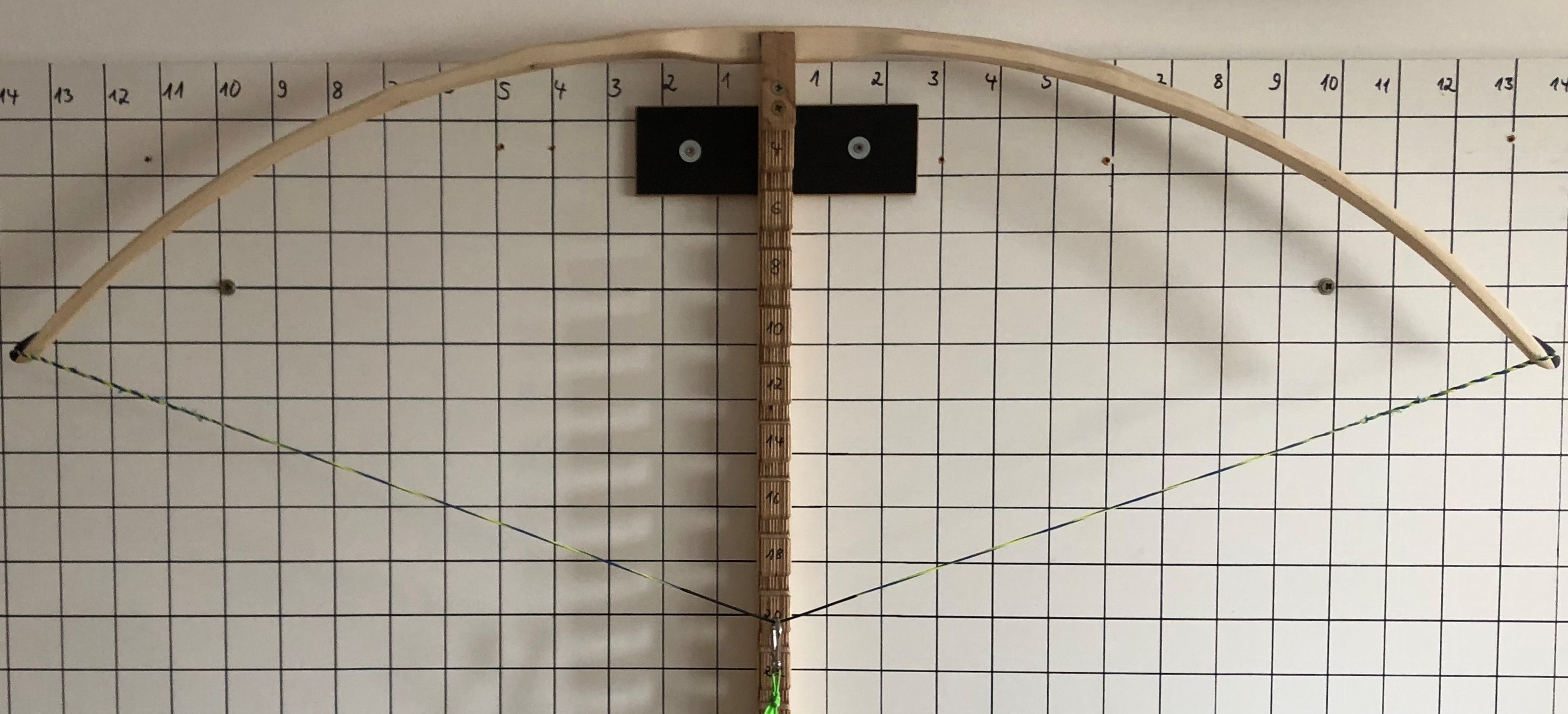 Die Bilder des entspannten Bogens, auf Standhöhe und bei einem Auszug von 16'' habe ich unten eingefügt.