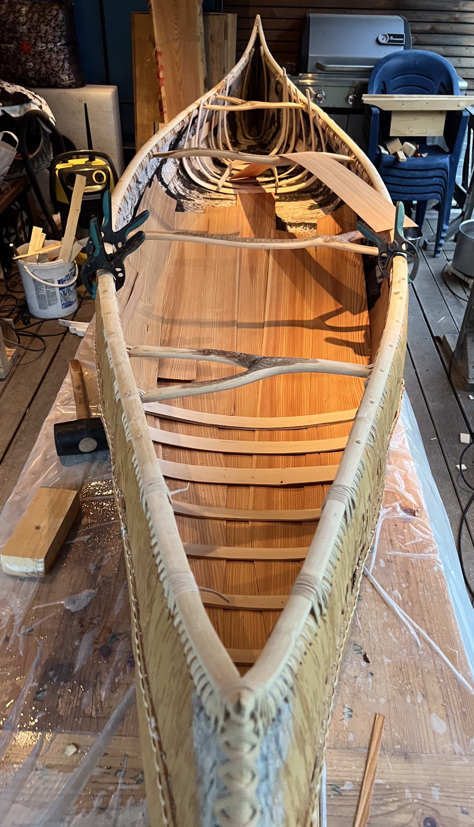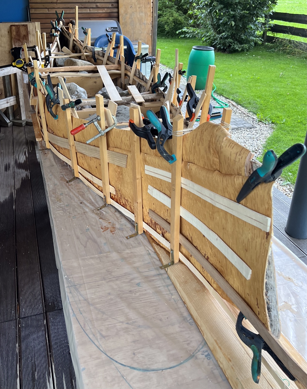 3,8m lang, 80cm breit, 33cm hoch, Birkenrinde aus Sibirien (sehr lebhafte Rinde, schwer in Form zu bringen, viel heißes Wasser notwendig), Gunwales aus Haselsaplingen, Caping aus Ahornsapling, Holznägel aus Esche, Thwarts und Rippen aus Haselsaplingen, Sheating aus Lärchenfurnier, die Rinde wurde mit Rattanstreifen vernäht, abgedichtet wurde mit Klebt und Dichtet von Würth (hitzestabil, kein Problem mit der prallen Sonne). Ernte und erste Arbeiten im Februar. Hauptarbeit von Mitte Juli bis gestern, da habe ich das Leinölfirnis aufgebracht. Das Kanu ist sehr stabil und sehr drehfreudig. Viel Spaß beim Bilder schmökern. LG Stephan